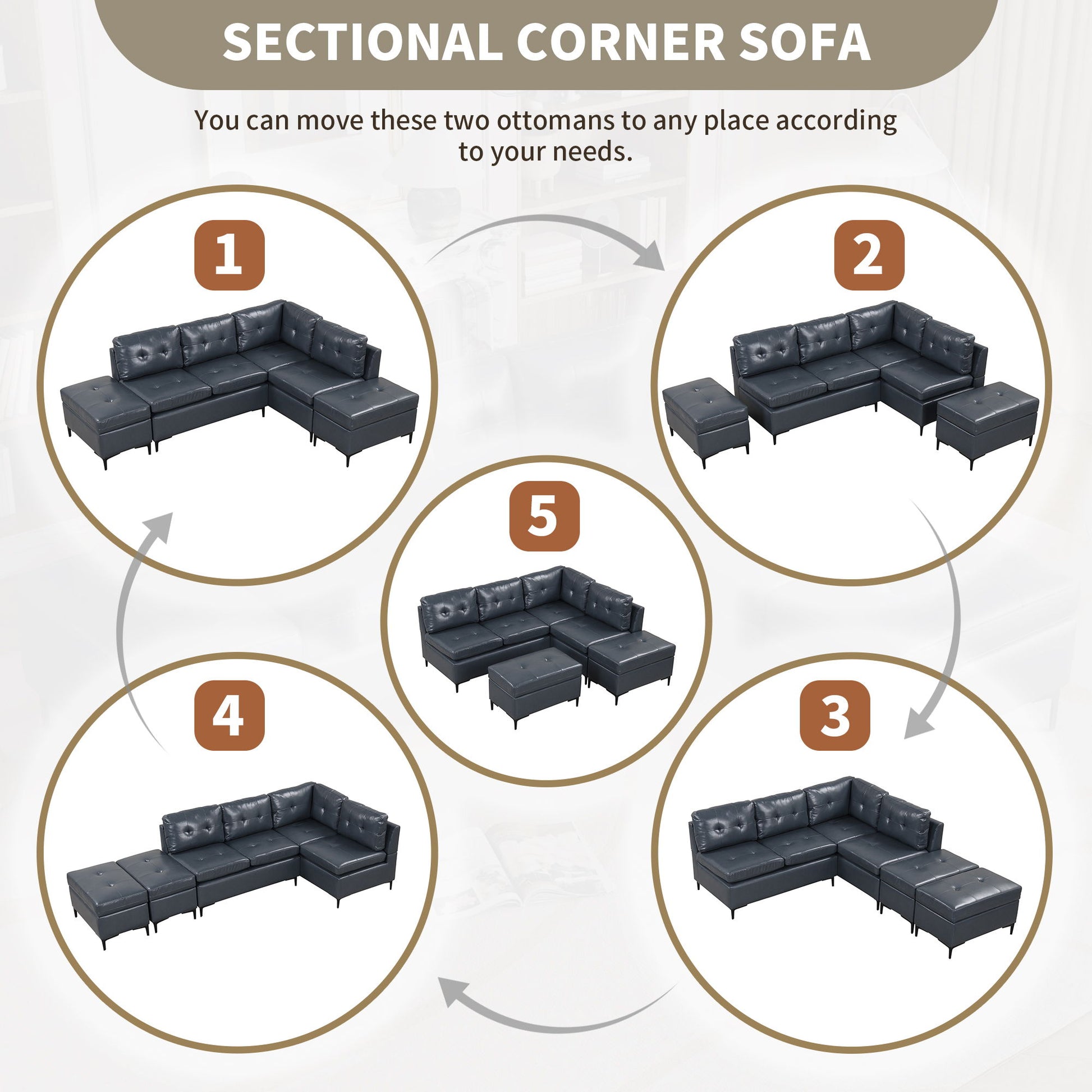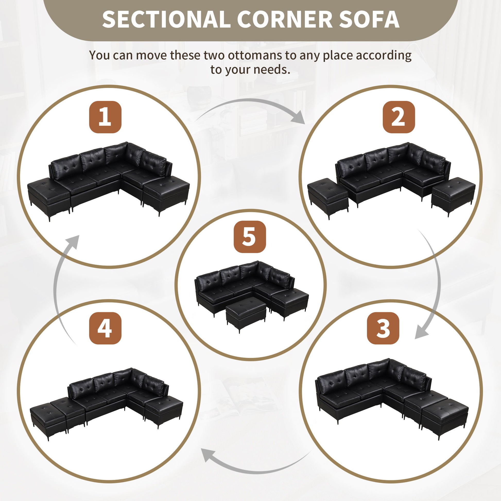 Convenient Storage Ottomans: The two ottomans in this sectional couch provide extra storage space for items like magazines, toys, and blankets, making them easily accessible. Ergonomic Backrests for Comfort: The ergonomic backrests of this sectional sofa reduce stress on the neck and back, offering optimal support and a luxurious sitting experience. Flexible and Modern Design: This sectional sofa can be arranged in various ways to fit different living areas, and its modern design allows for sitting and lying down comfortably. High-Quality Materials: Made of soft and durable PU leather, this sectional sofa features seat cushions with springs and high-density foam for comfortable body support and overall relaxation. Stylish and Contemporary Appearance: With sleek lines and a modern look, this sectional sofa complements different home decor styles, adding comfort and elegance to your living space.
