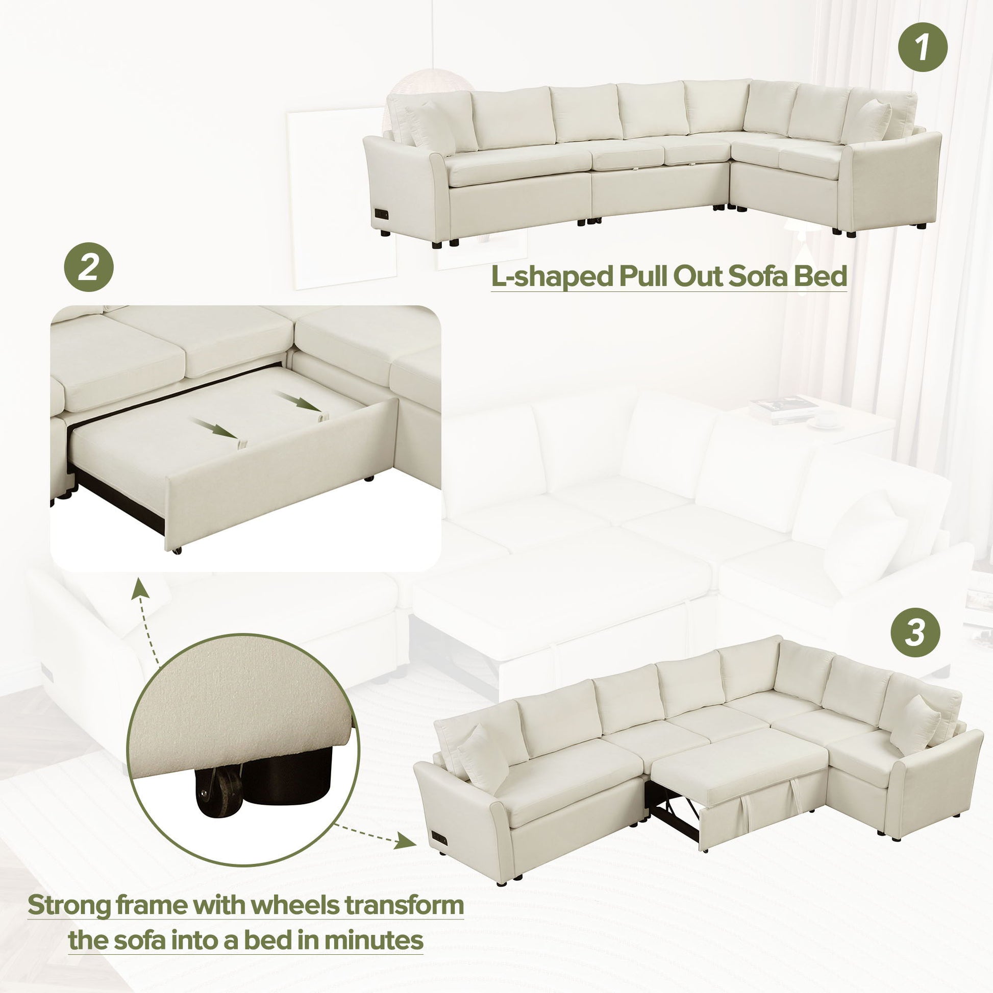 L-Shaped Sofa Convertible Sofa Bed Pull Out Sofa Sleeper With Two Back Pillows, Two USB Ports And Two Power Sockets For Living Room - Beige