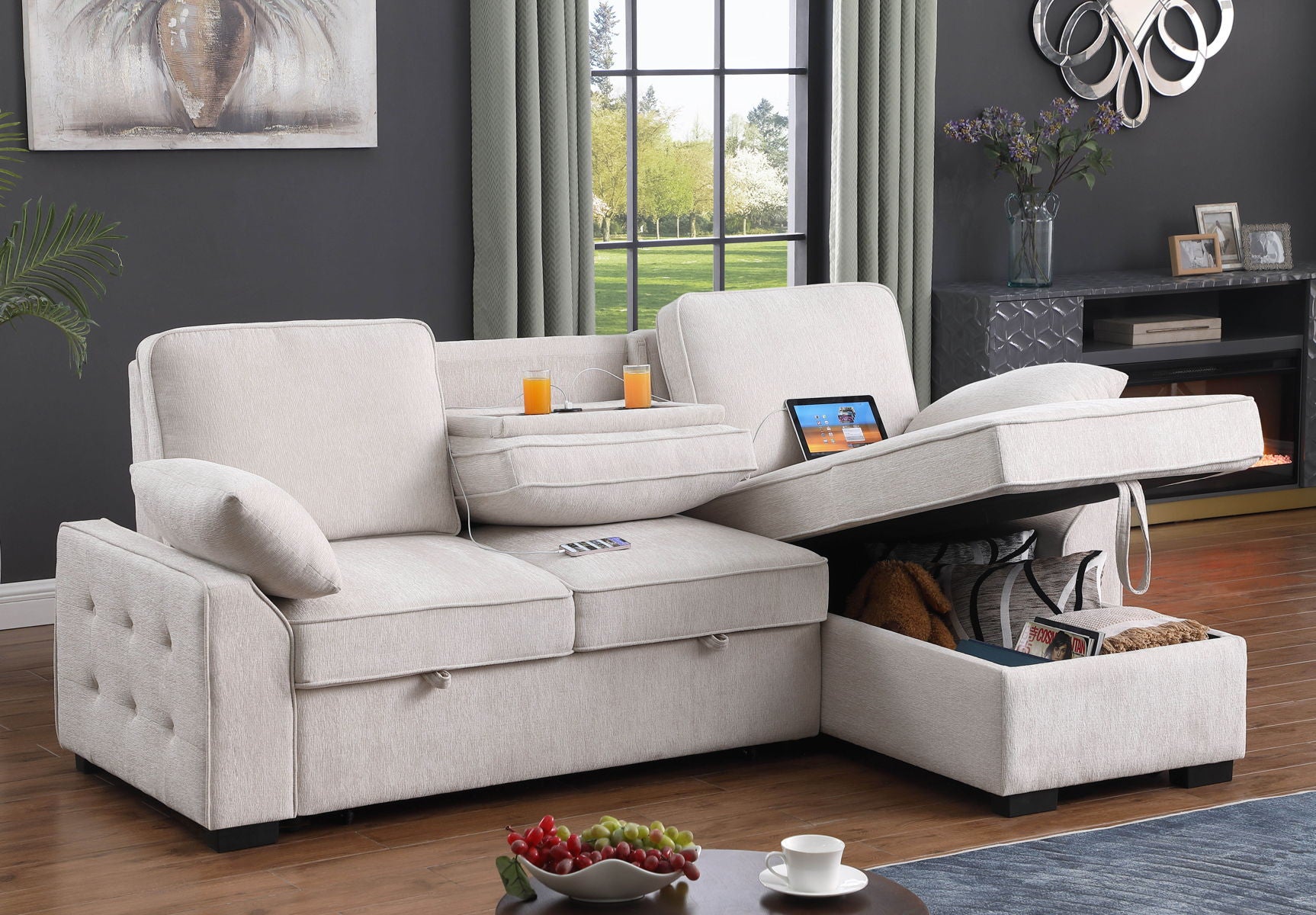 Mackenzie - Chenille Fabric Sleeper Sectional With Right-Facing Storage Chaise, Drop-Down Table, Cup Holders And Charging Ports - Beige