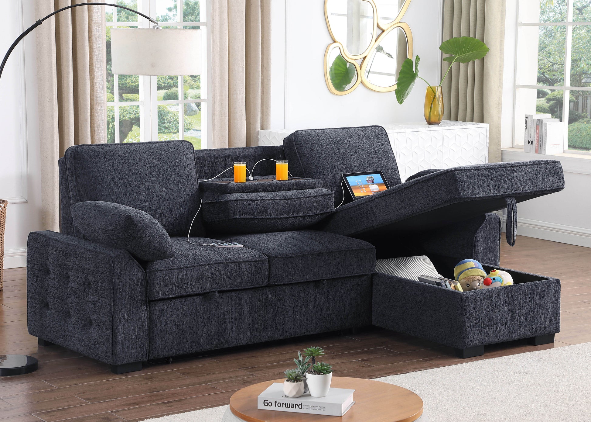 Discover the Mackenzie Chenille Fabric Sleeper Sectional – a fusion of style, comfort, and functionality. Made with quality fabric, it adds elegance and warmth to any room. Effortlessly transform it into a sleeper for guests. Its drop-down table has built-in cup holders, and the console features USB and USB-C ports to keep devices charged. The chaise provides storage for essentials. The Mackenzie Sectional is more than furniture; it's a lifestyle statement combining design and durability. Don't miss out!