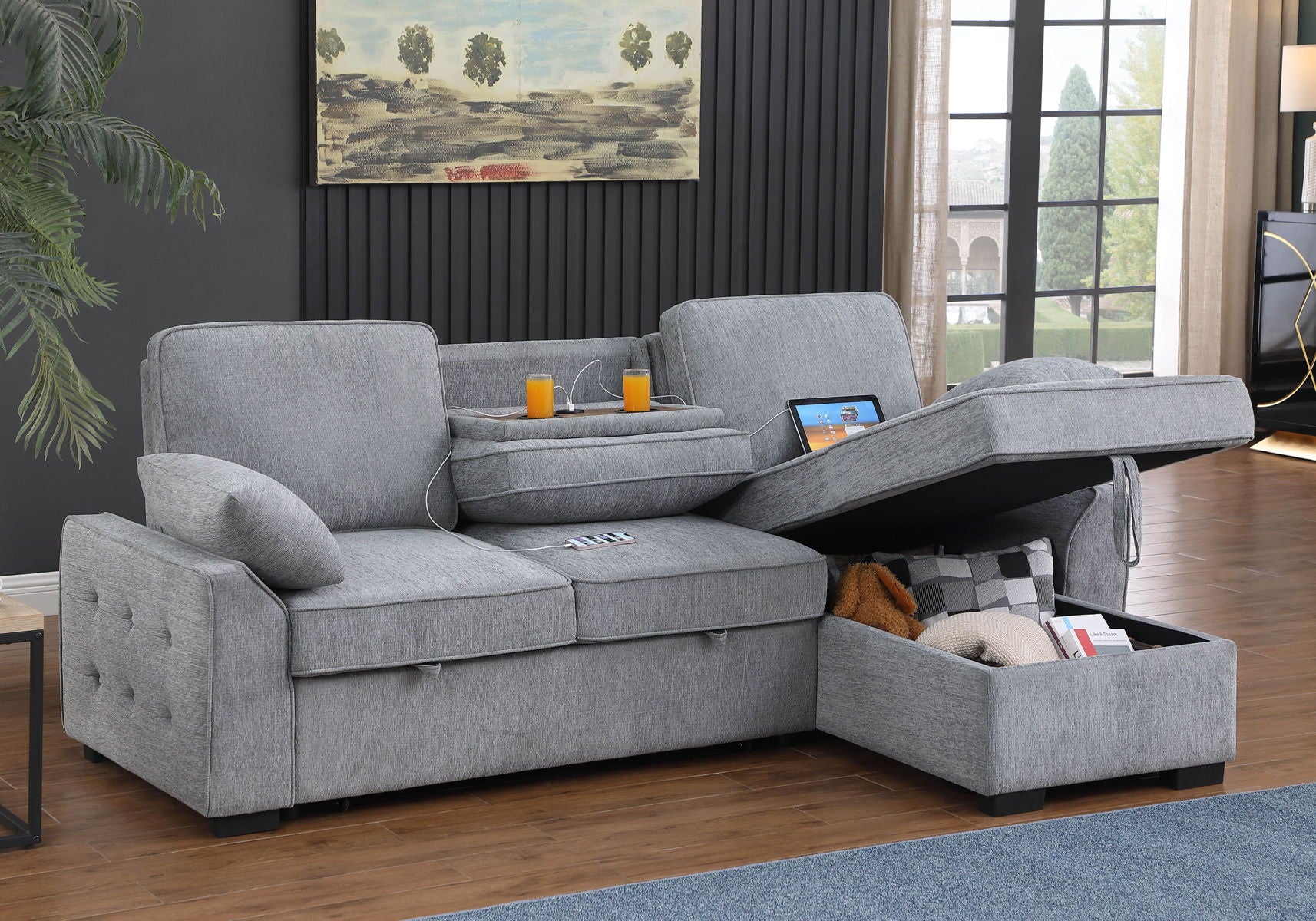 Mackenzie - Chenille Fabric Sleeper Sectional With Right-Facing Storage Chaise, Drop-Down Table, Cup Holders And Charging Ports - Light Gray
