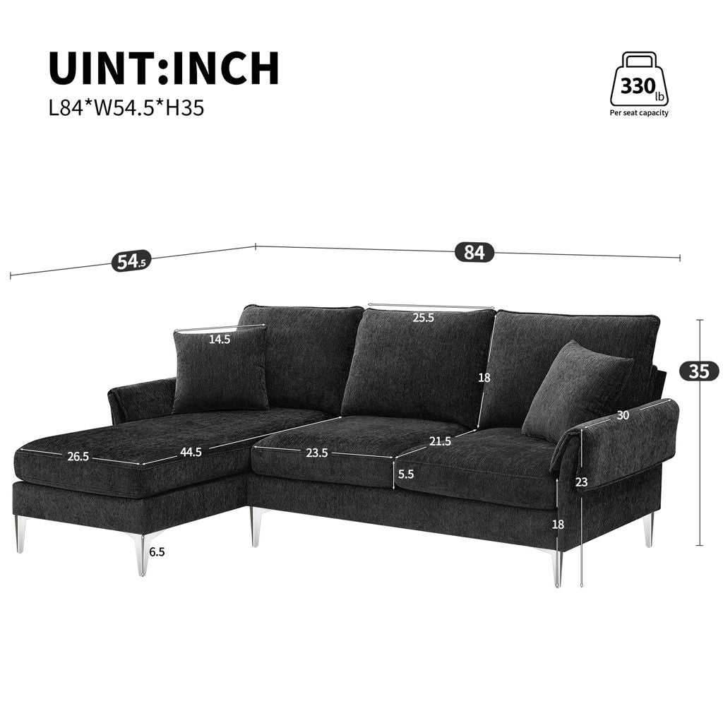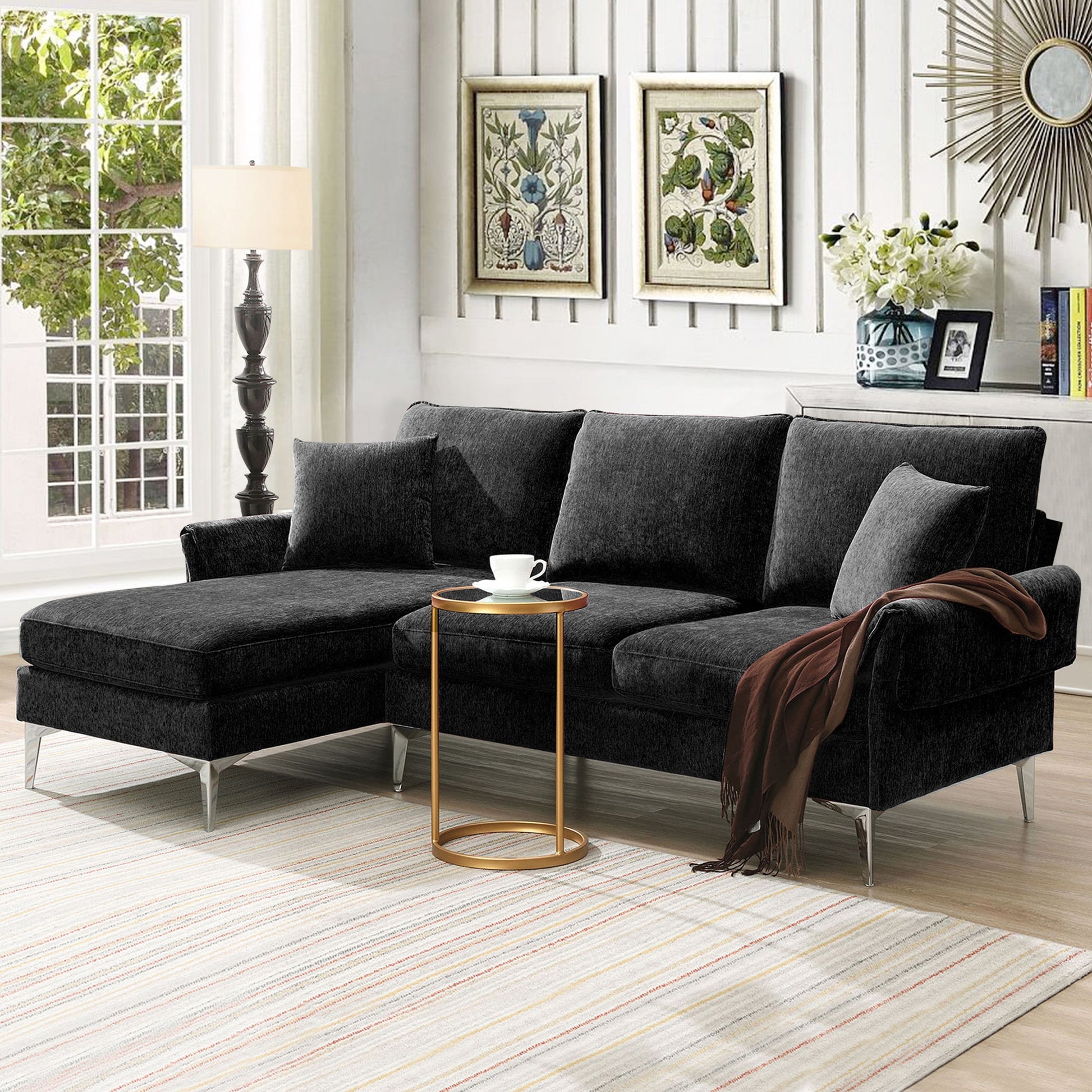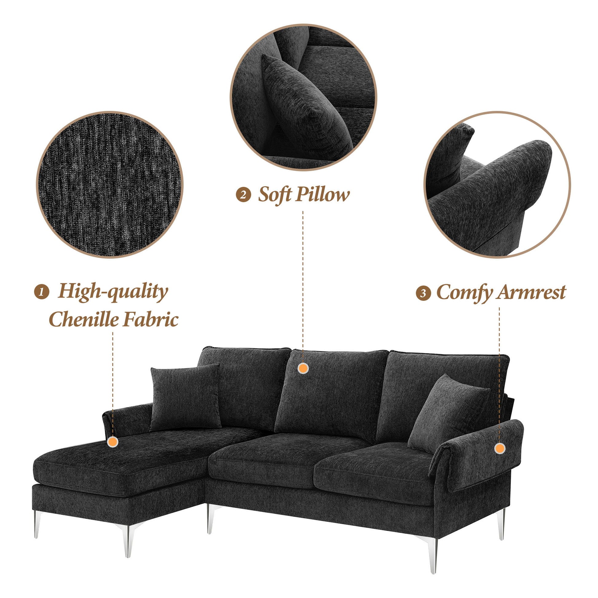 Modern Chenille L-Shaped Sofa With Reversible Lounge, Convertible Sectional Couch Set, 4 Seat Indoor Furniture With Reversible Chaise, Fit For Living Room, Apartment (2 Pillows) - Black