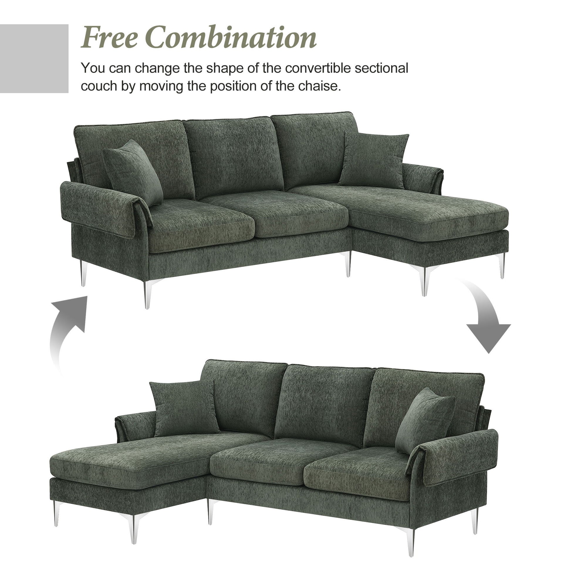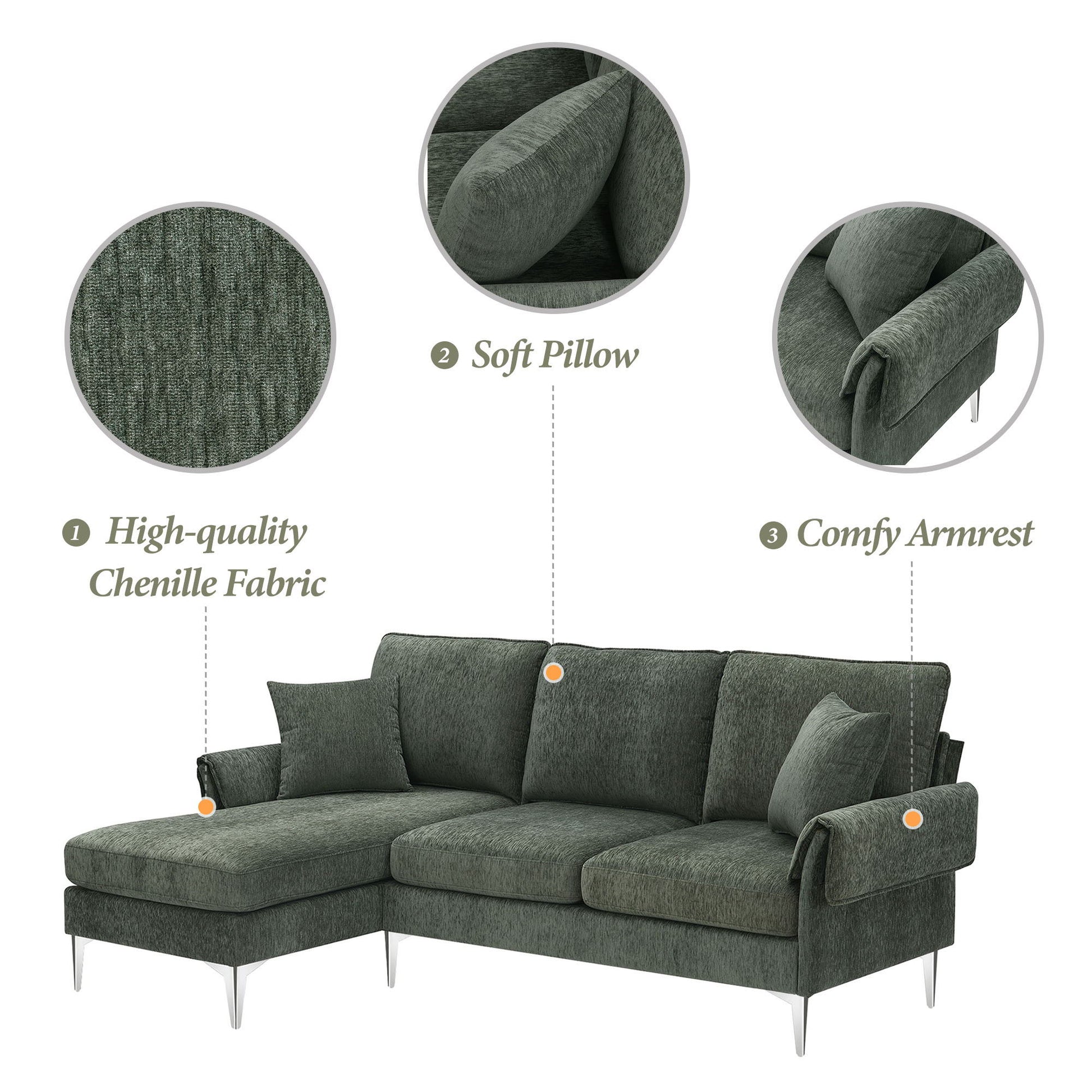 Modern Chenille L-Shaped Sofa With Reversible Lounge, Convertible Sectional Couch Set, 4 Seat Indoor Furniture With Reversible Chaise, Fit For Living Room, Apartment (2 Pillows) - Green