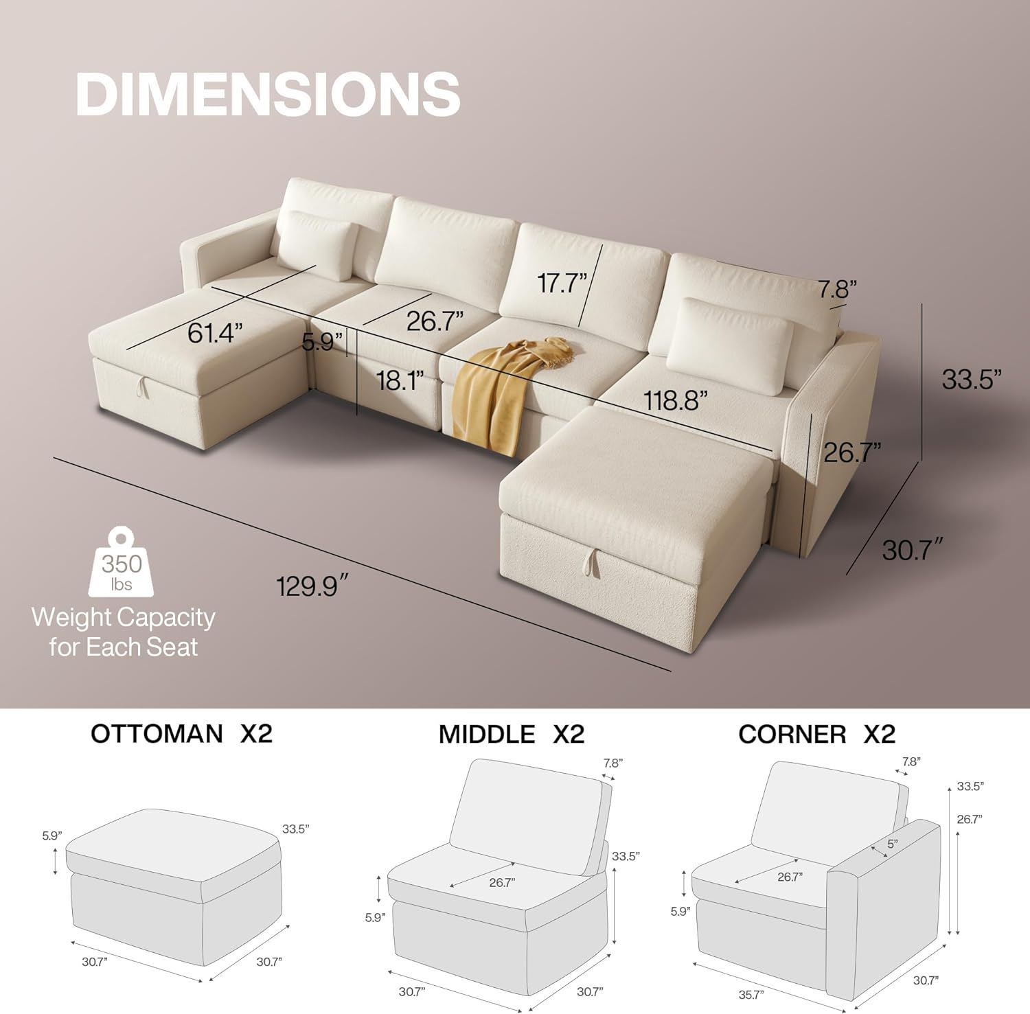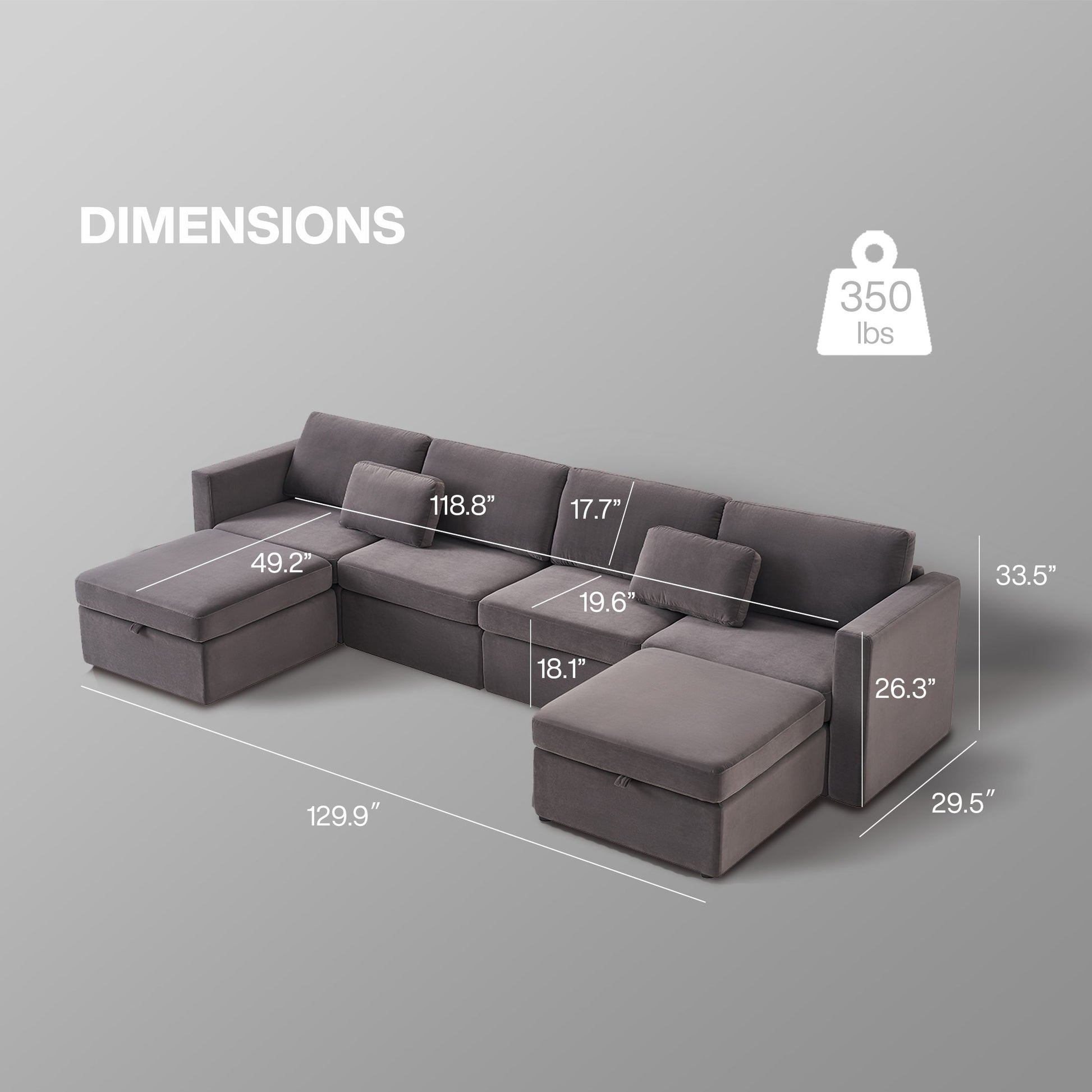 129.9"W x 49.2"D x 33.5"H - 352.0 lb