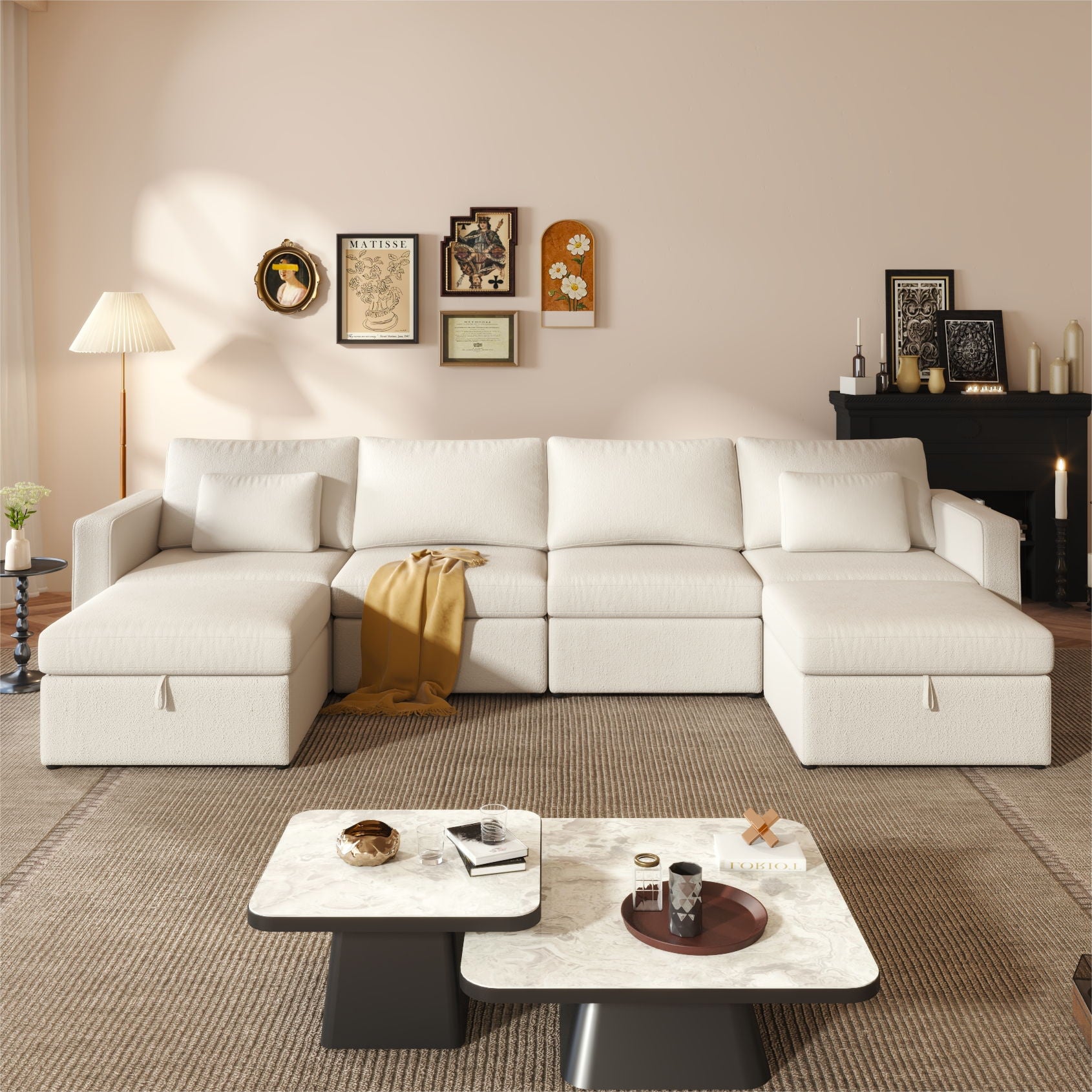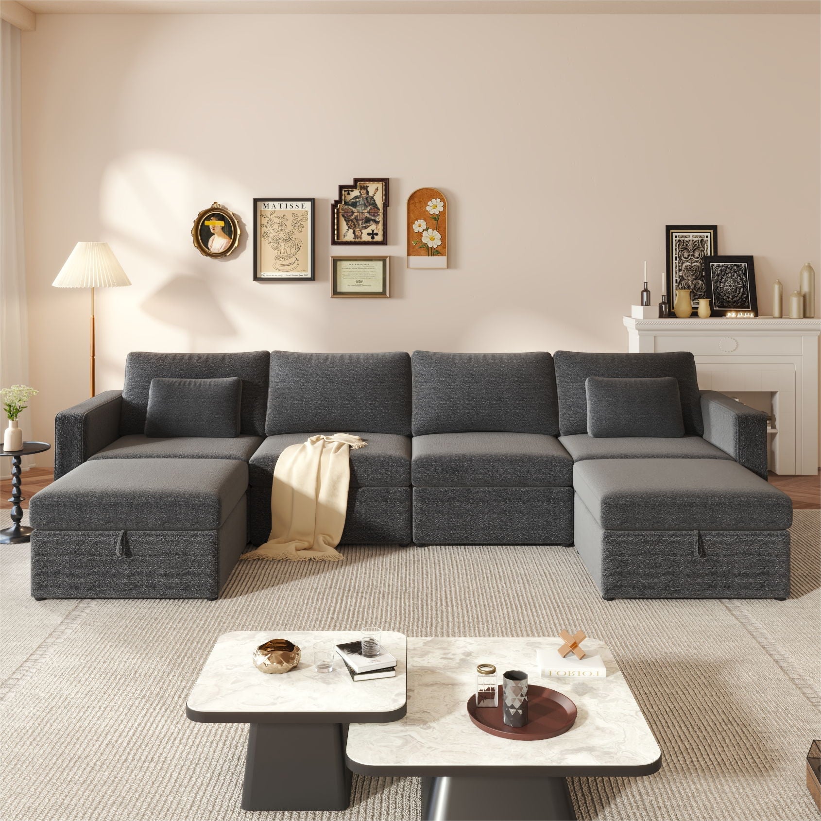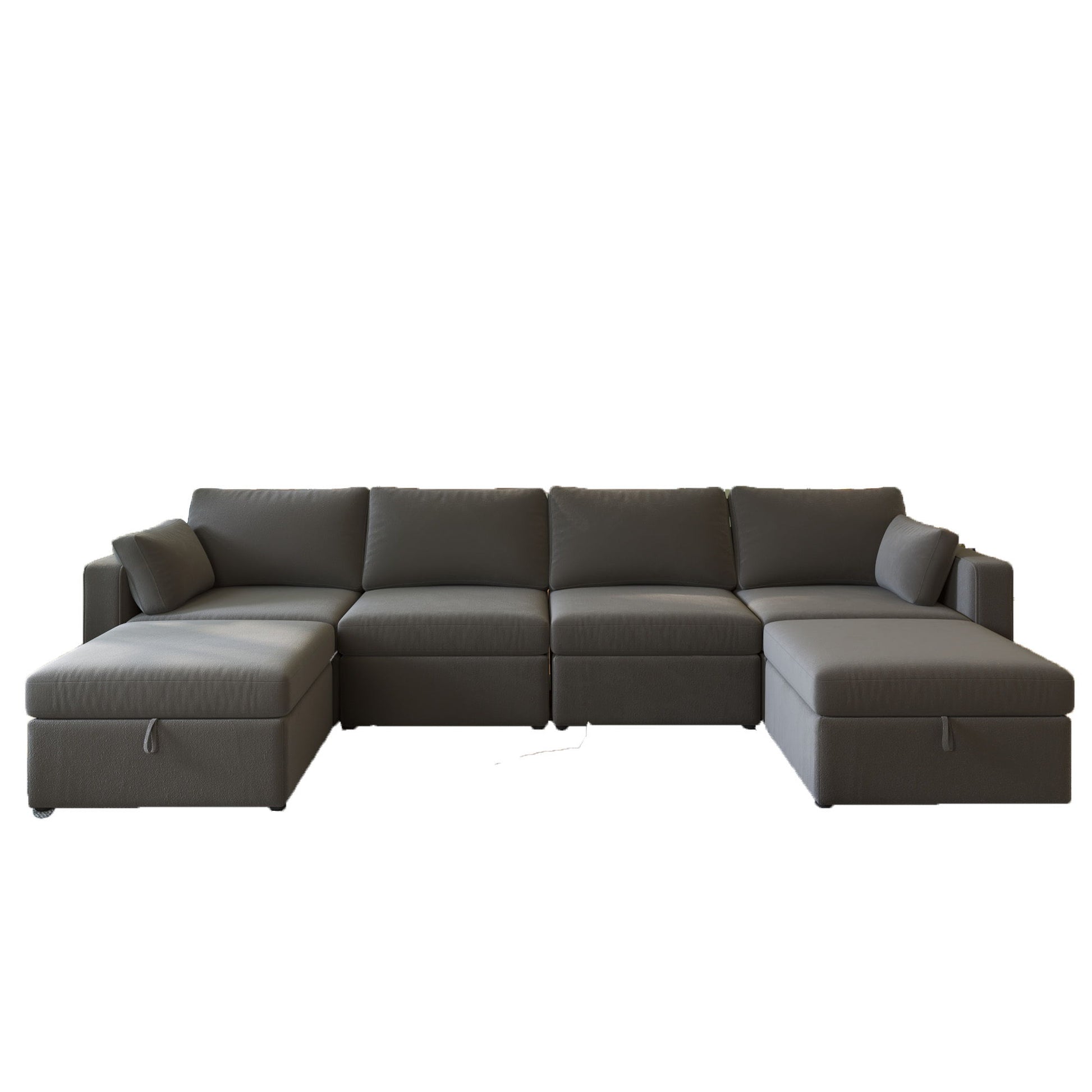 Sumptuous Comfort: Indulge in luxurious coziness with generously cushioned oversized sectional couch, crafted with top-quality materials for unmatched comfort. Versatile Arrangement: Effortlessly configure this modular sectional sofa into U-shape or L-shape for movie nights, social gatherings, or leisurely Sundays with family and friends. Sophisticated Design: Enhance your living room with sleek and contemporary aesthetic featuring sleek lines, tufted accents, and modern silhouette for a touch of refinement. Integrated Storage Ottoman: Stay organized with the built-in storage compartments in the oversized modular couch ottoman, keeping blankets, pillows, and magazines neatly stored. Exceptional Durability & Pet-Friendly: Built to endure daily use, this sectional couch offers exceptional durability and pet-friendly features without compromising on style or functionality.