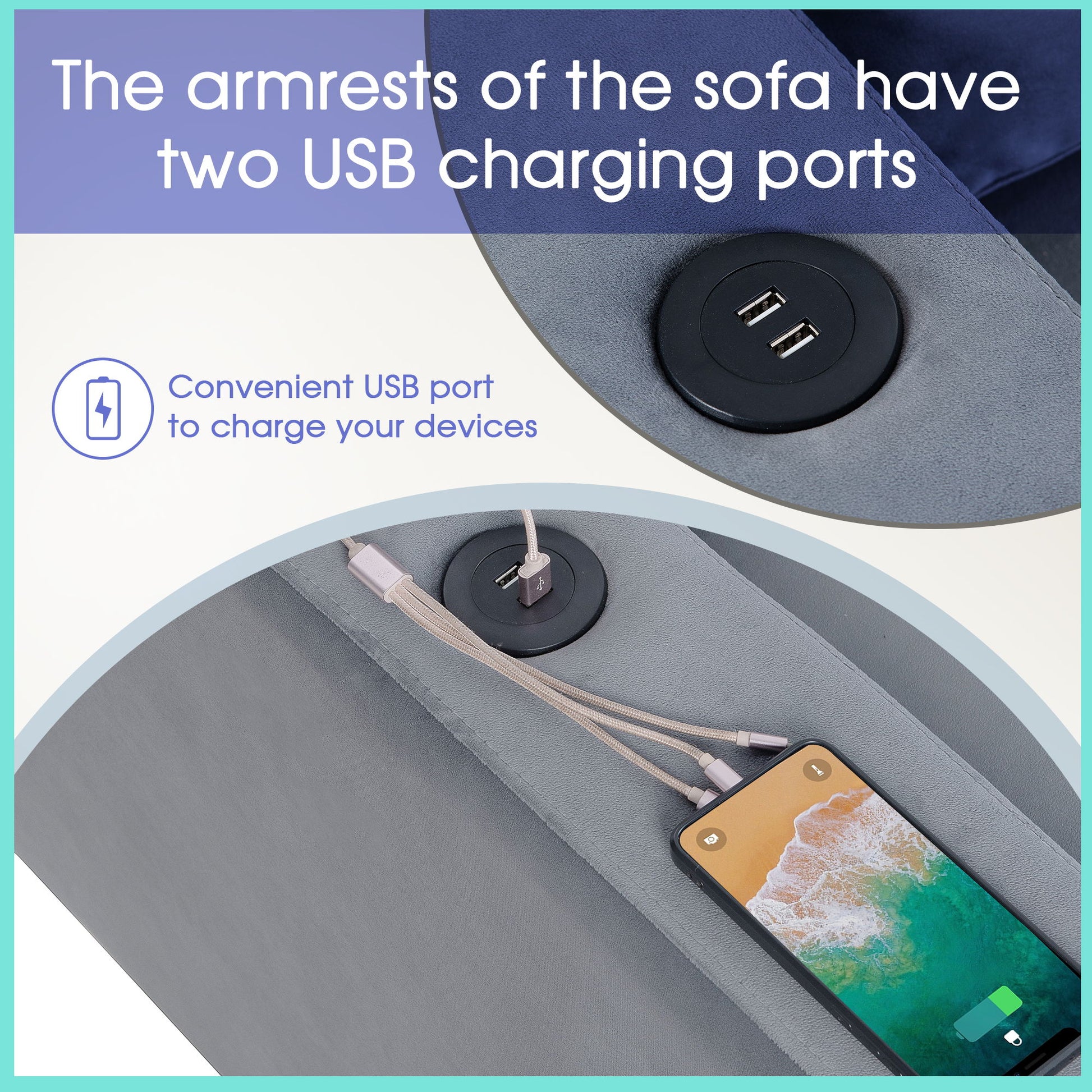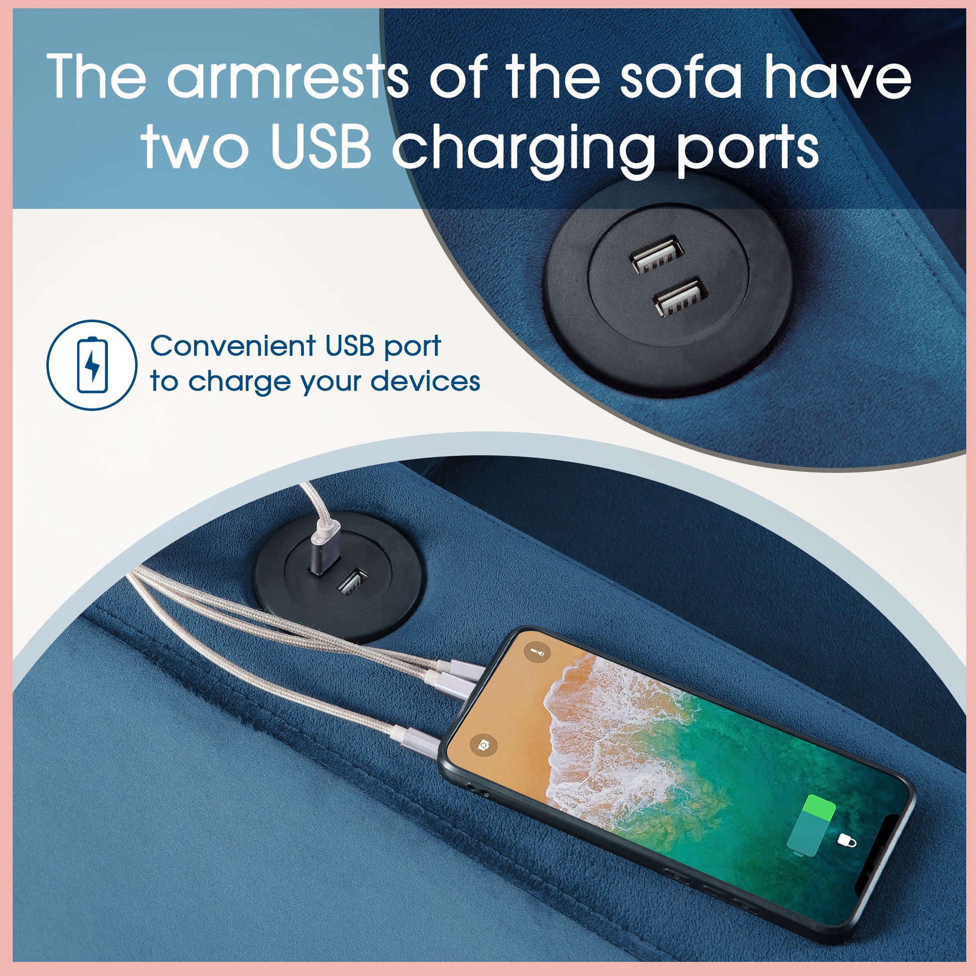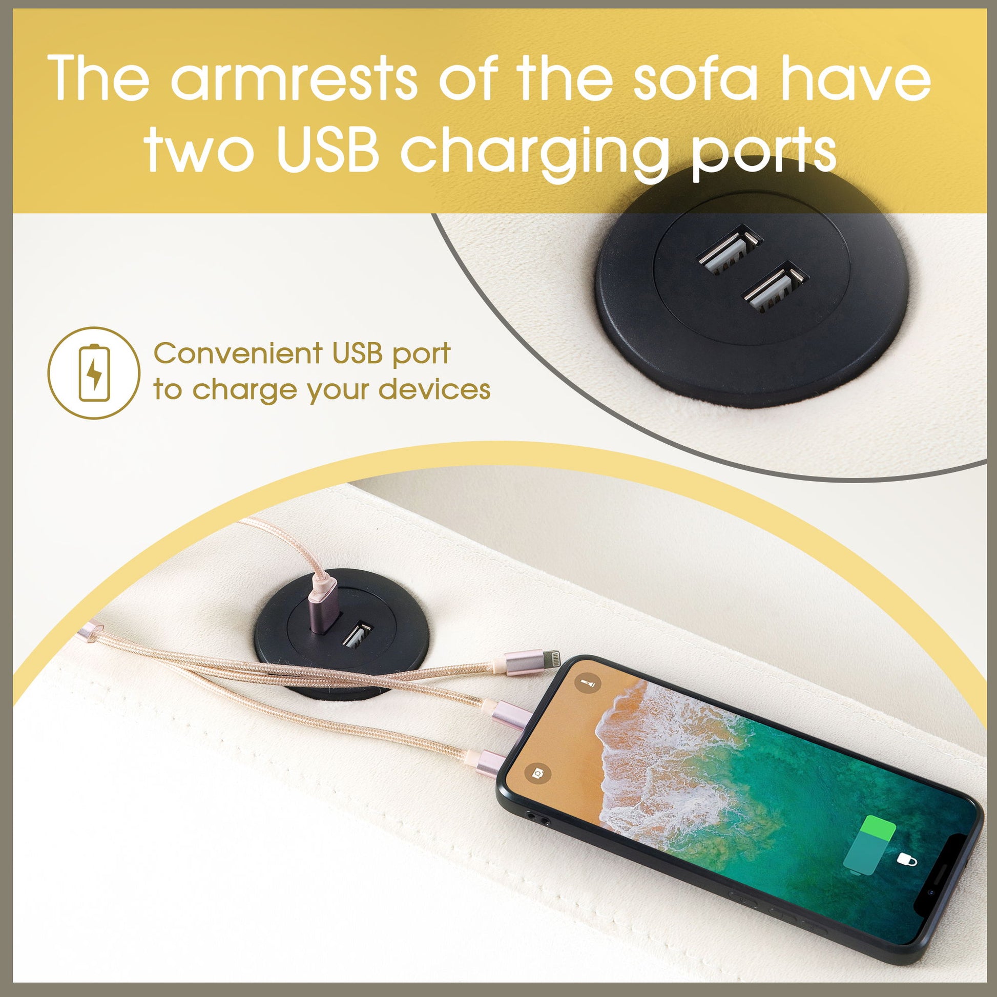 Convenient Design: Armrest equipped with 2 charging ports for convenient device charging while lounging. Flexible Modular Design: Each seat can be moved and re-matched for customizable layouts, showcasing the charm of the sectional sofa. High-Quality Construction: Solid wood frame supports up to 330 lbs, ensuring stability and durability for long-lasting use. Comfortable Velvet Material: High-quality velvet fabric with high supportive cushions and pocket spring structure for comfort and even support. Stylish and Versatile: Simple line design adds a fresh and stylish touch, suitable for various spaces including living rooms, bedrooms, and offices.