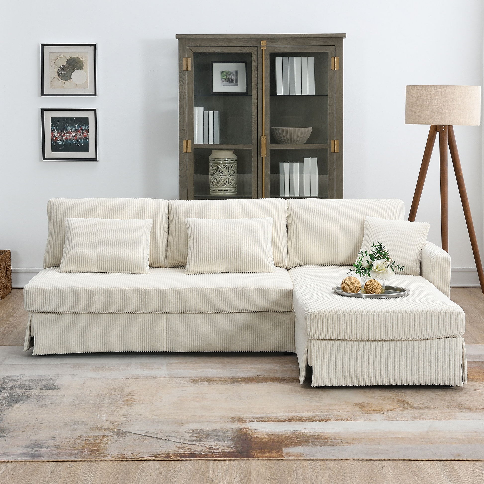 Modern L-Shaped Corduroy Sofa With Reversible Chaise, 4-Seat Upholstered Sectional Indoor Furniture, Convertible Sleeper Couch With Pillows For Living Room, Apartment - Beige