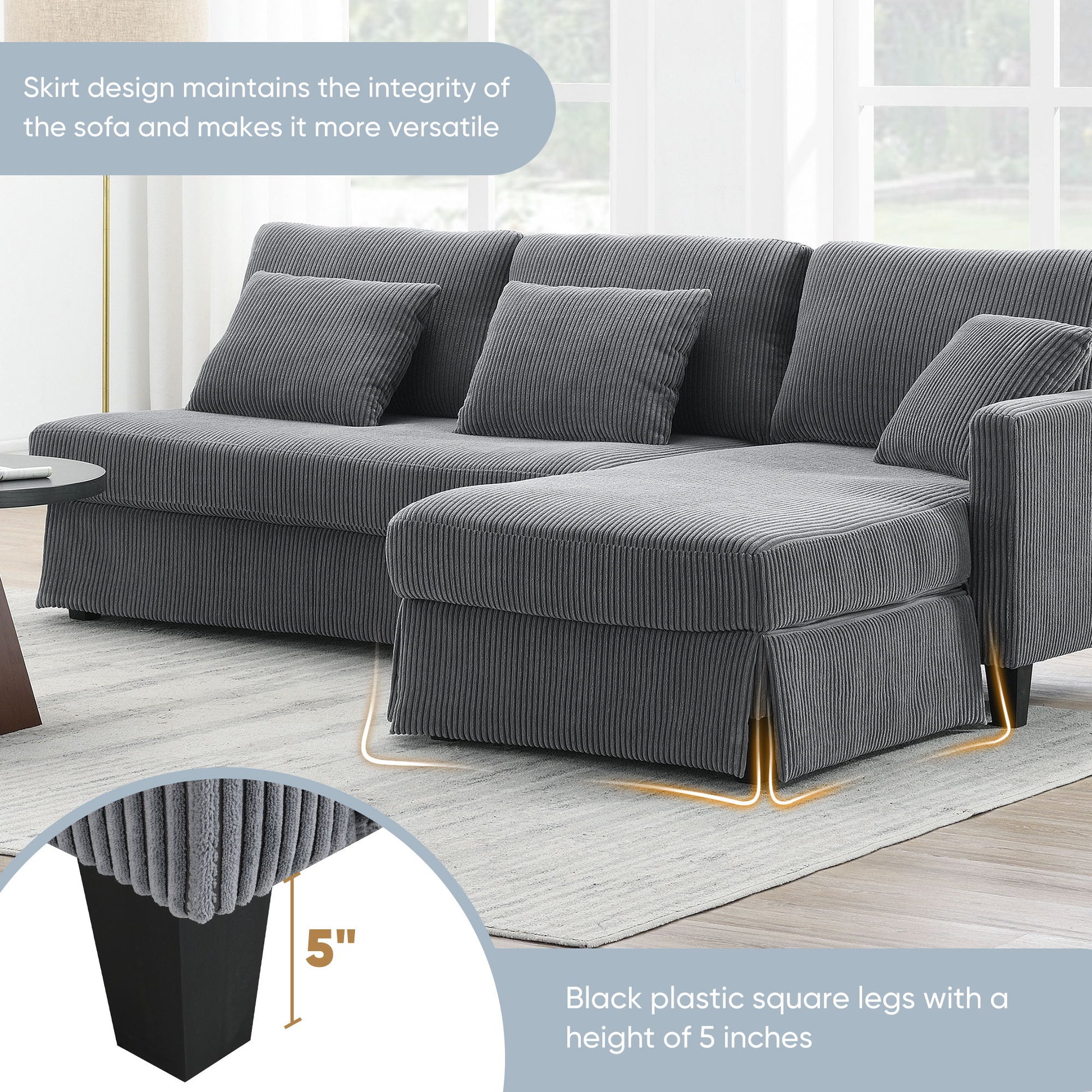 Modern L-Shaped Corduroy Sofa With Reversible Chaise, 4-Seat Upholstered Sectional Indoor Furniture, Convertible Sleeper Couch With Pillows For Living Room, Apartment - Gray