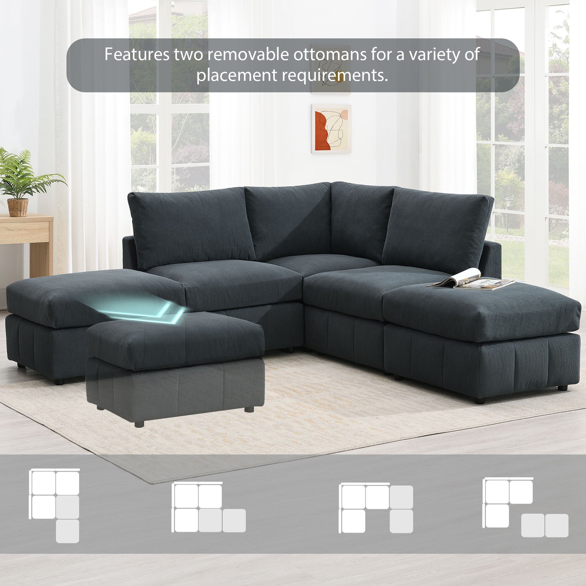 Modern Sectional Sofa With Vertical Stripes, 5 Seat Armless Couch Set With Convertible Ottomans, Various Combinations, L-Shape Indoor Furniture For Living Room