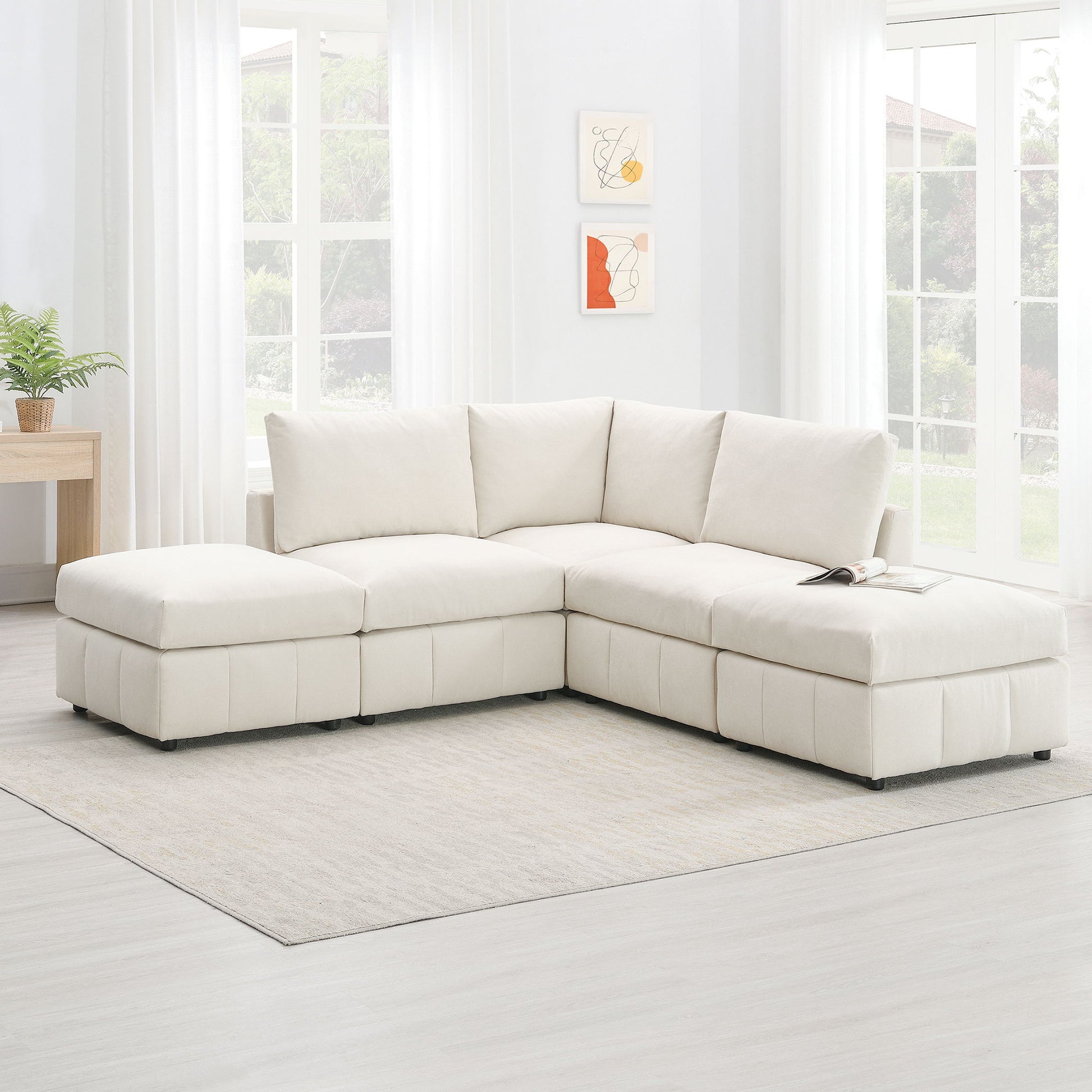 Modern Sectional Sofa With Vertical Stripes, 5 Seat Armless Couch Set With Convertible Ottomans, Various Combinations, L-Shape Indoor Furniture For Living Room - Beige