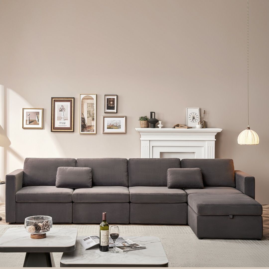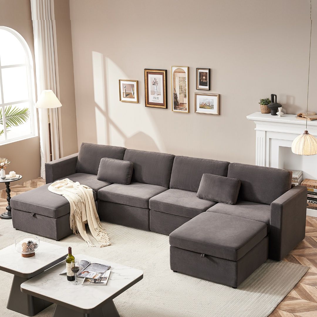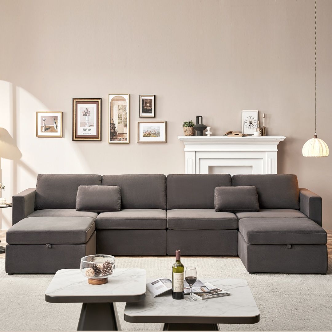 Sumptuous Comfort: Experience unmatched luxury with the generously cushioned oversized sectional couch, meticulously crafted for superior comfort and relaxation. Versatile Arrangement: Effortlessly configure the modular sectional sofa into a U-shape or an L-shape to create the perfect seating setup for various occasions, from movie nights to social gatherings. Sophisticated Design: Elevate the elegance of your living room with the sleek and contemporary aesthetic of the modular sectional sofa, featuring sleek lines, tufted accents, and a modern silhouette. Integrated Storage Ottoman: Stay organized with the oversized modular couch ottoman that includes built-in storage compartments, perfect for keeping blankets, pillows, and magazines neatly organized. Exceptional Durability & Pet-Friendly: Invest in furniture built to endure daily use, with high-quality materials selected for resilience and long-lasting performance, making it pet-friendly and durable for years to come.