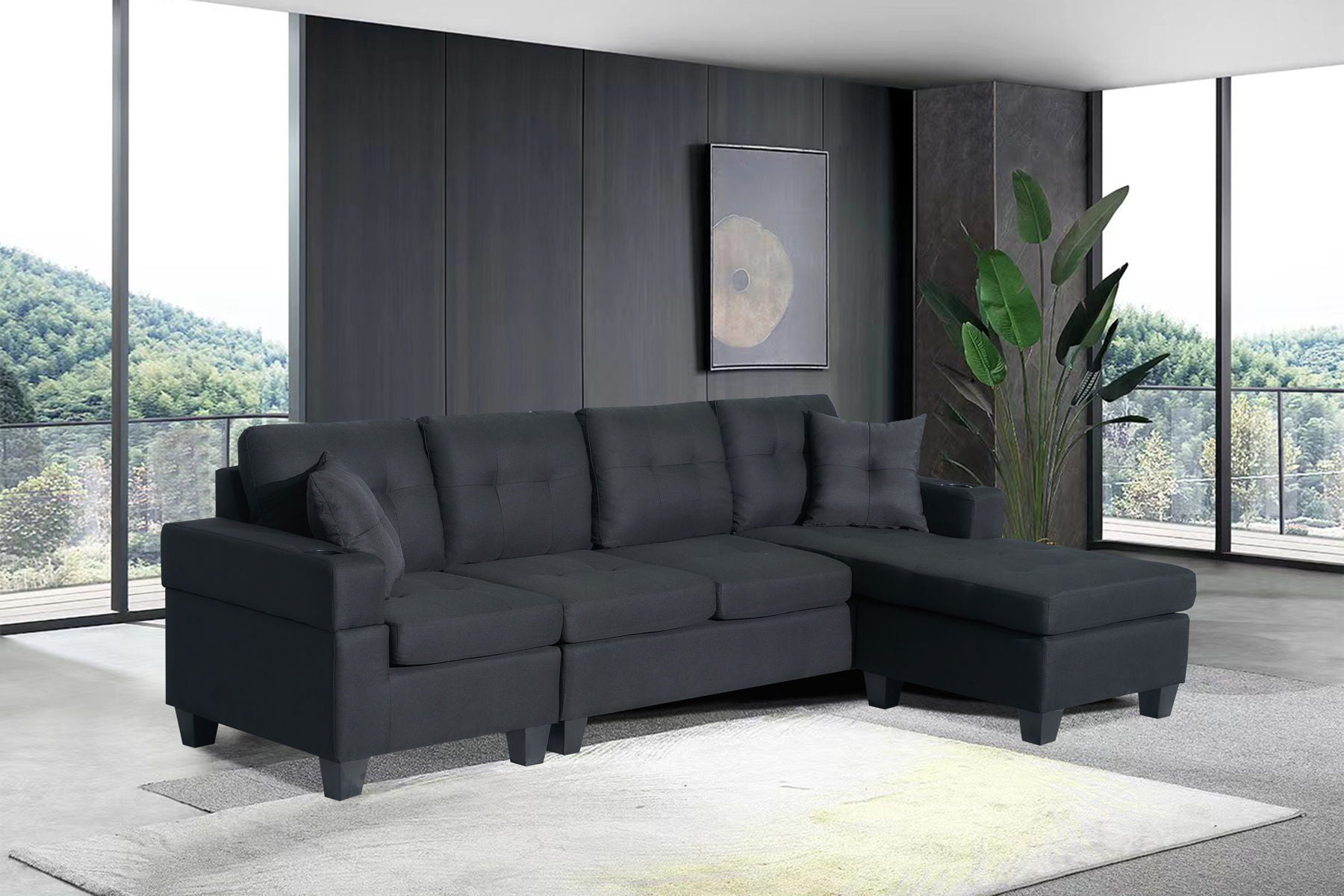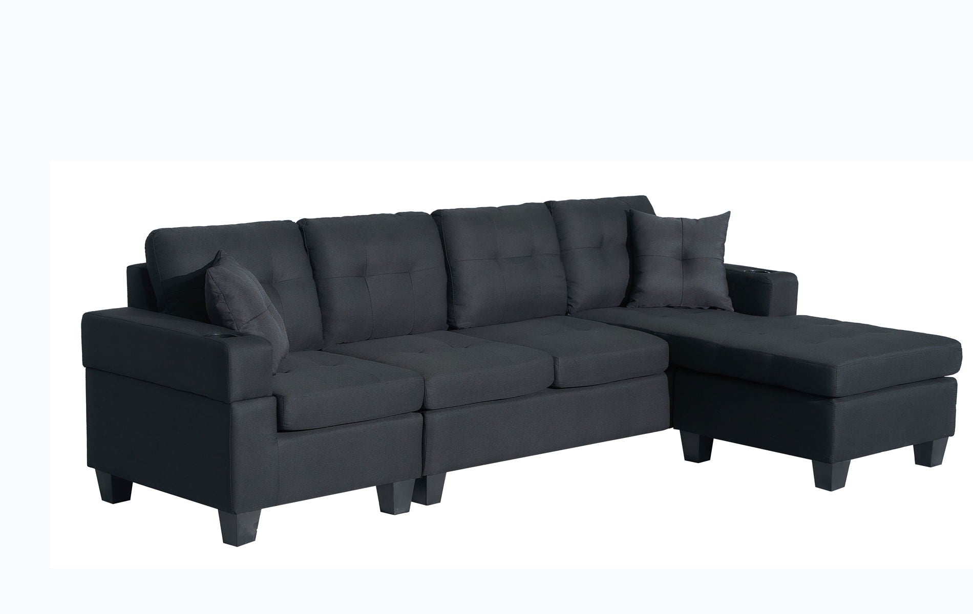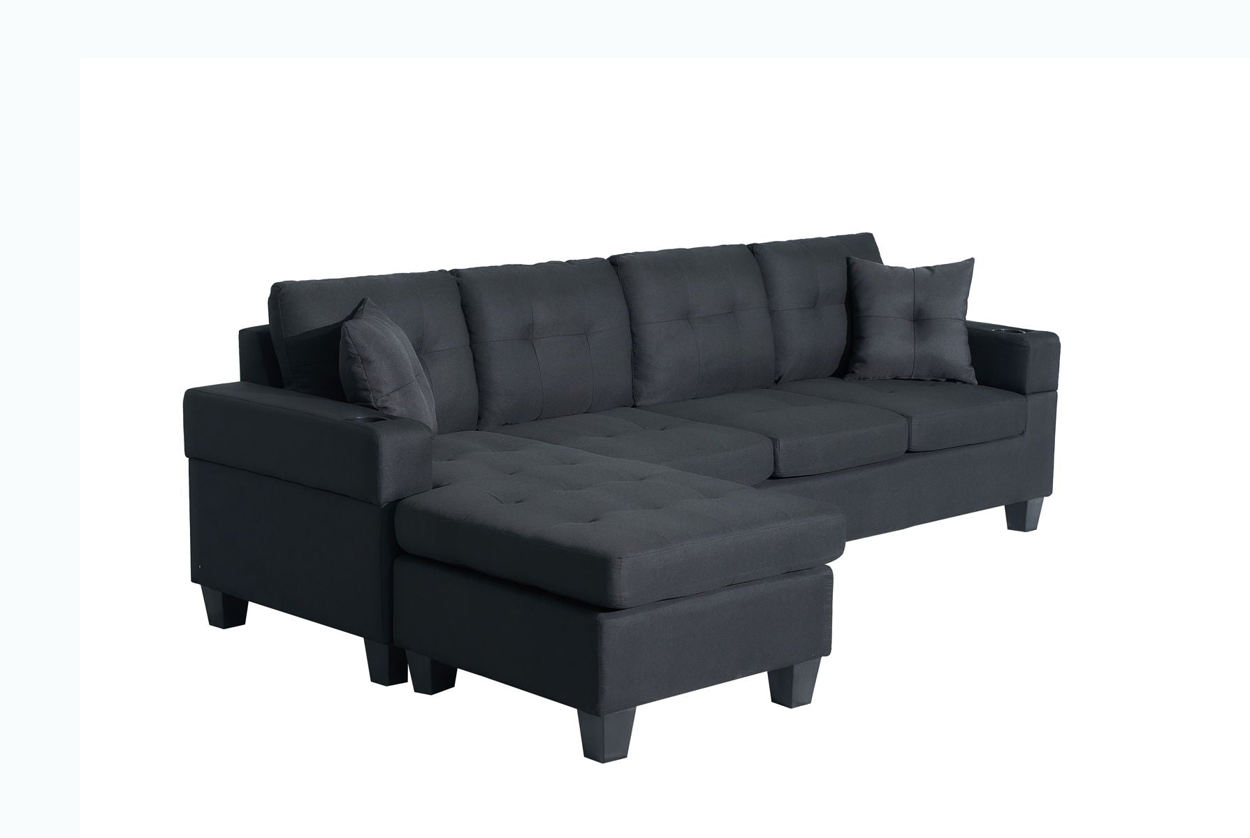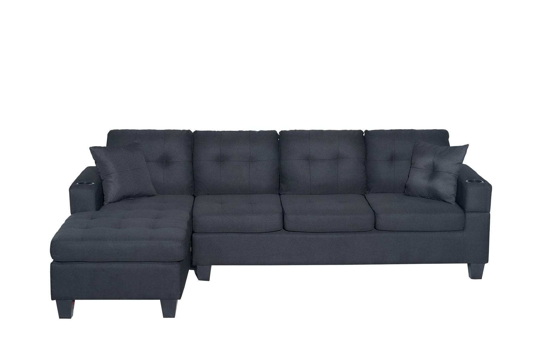 Nala - Wide Fabric Reversible Sectional Sofa With Cupholders And 2 Throw Pillows - Black