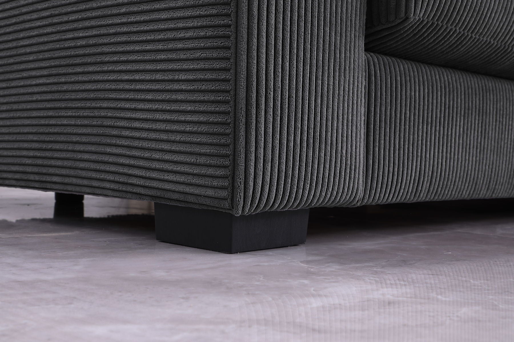 Enhance your living space with our Sectional Set, meticulously crafted for a perfect blend of style and comfort. The luxurious, textured corduroy fabric ensures both tactile pleasure and lasting durability. Designed with relaxation in mind, the sectional features generously padded armrests that invite you to unwind. Carefully positioned for comfort and a sleek aesthetic, the armrests complement the configuration, which includes a chaise on the right-hand side for a balance of lounging space and seating comfort. The centerpiece loveseat, perfect for cozy gatherings, is complemented by six solid-colored throw pillows, adding a layer of personalization and comfort. Supported by black plastic legs, this ensemble seamlessly integrates stability into its overall design.