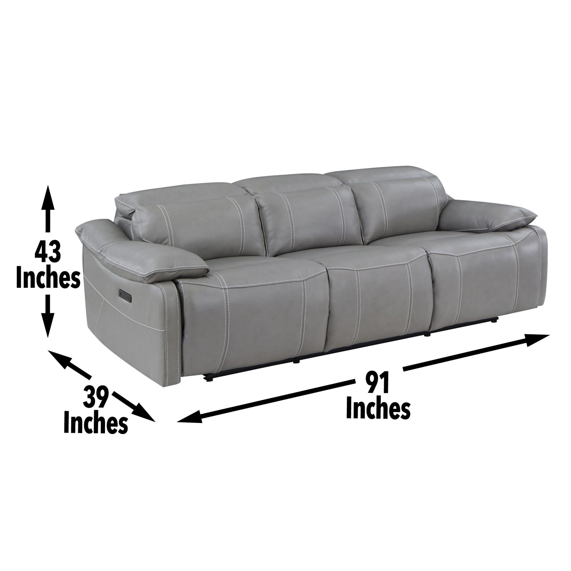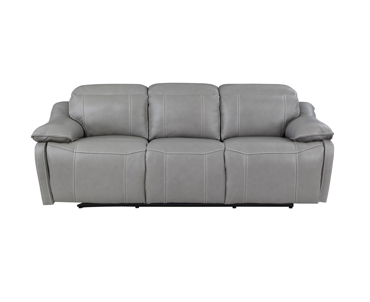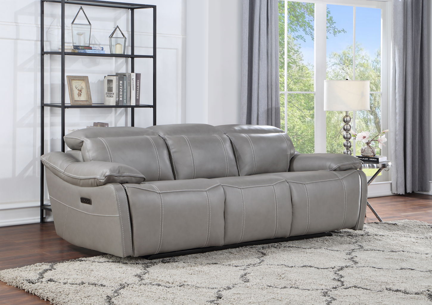 Euro-styled reclining Sofa with sleek style and clean lines. The Alpine is covered in decadently soft leather fronts with power headrest and power footrest functionality. The headrest lays flat when closed for a look that does not scream recliner and the gray cover blends with virtually any decor.