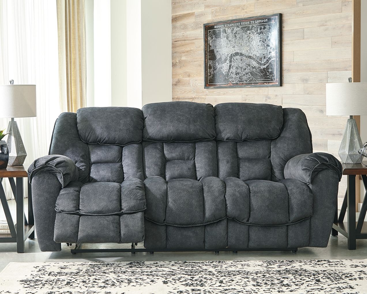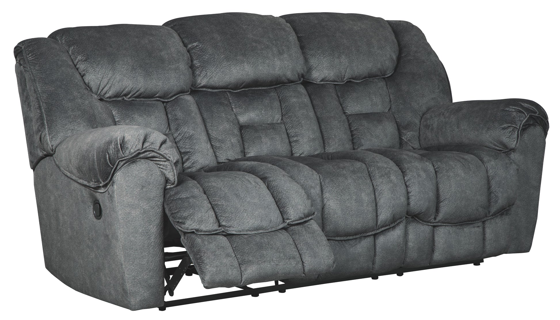 Sometimes seeing is believing. Rest assured this reclining sofa is every bit as indulgent as it looks. Designed to put you in the lap of luxury, this generously scaled reclining sofa—wrapped in a wonderfully plush and practical granite gray upholstery—sports scooped pillow wrapped armrests and curvaceously cushioned head-neck support for feel-good flair.