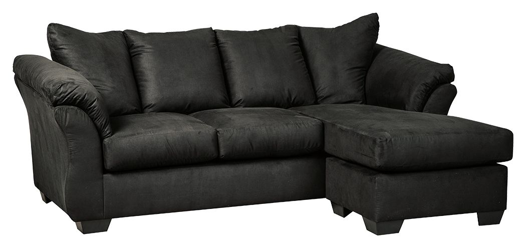 Talk about fine lines and great curves. That's the beauty of this sofa chaise made to suit your appreciation for clean, contemporary style. A striking flared frame, comfy pillow top armrests and an ultra-soft upholstery that holds up to everyday living complete this fashion statement. Versatile chaise has a movable ottoman and reversible cushion and can be used on right or left side.