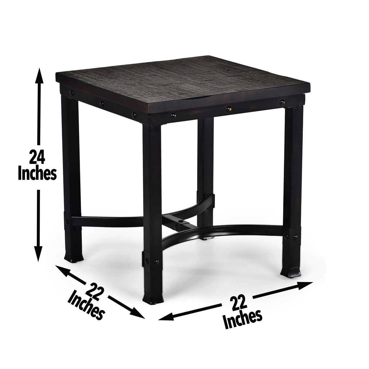 The Ambrose collection features a butcher block style wood surface that gives an aged and antiqued look. The rustic styling is accentuated by the dark iron legs and Demilune stretchers that connect in the middle. The distressed finish of the Ambrose end table will easily blend with existing décor. Available for purchase separately is the matching cocktail table. Your purchase includes one end table.