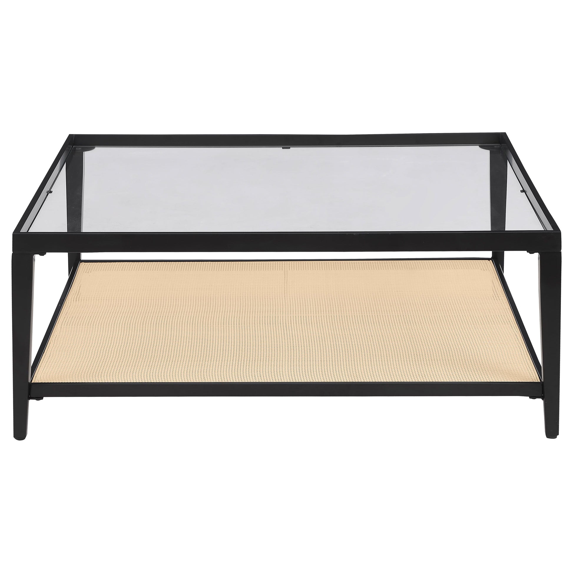 Enhance your living room with the contemporary charm of this sleek square coffee table. The black powder-coated metal frame creates a clean, modern aesthetic, while the recessed clear tempered glass top provides an elegant and spacious surface for your decor or coffee essentials. Below, a shelf crafted from radio weave polyethylene (PE) rattan adds a unique texture and convenient storage, blending natural materials with modern design. This coffee table brings a sophisticated, functional touch to any seating area, making it the perfect centerpiece for a stylish living room. Its versatile design complements various décor styles, elevating your space with ease.