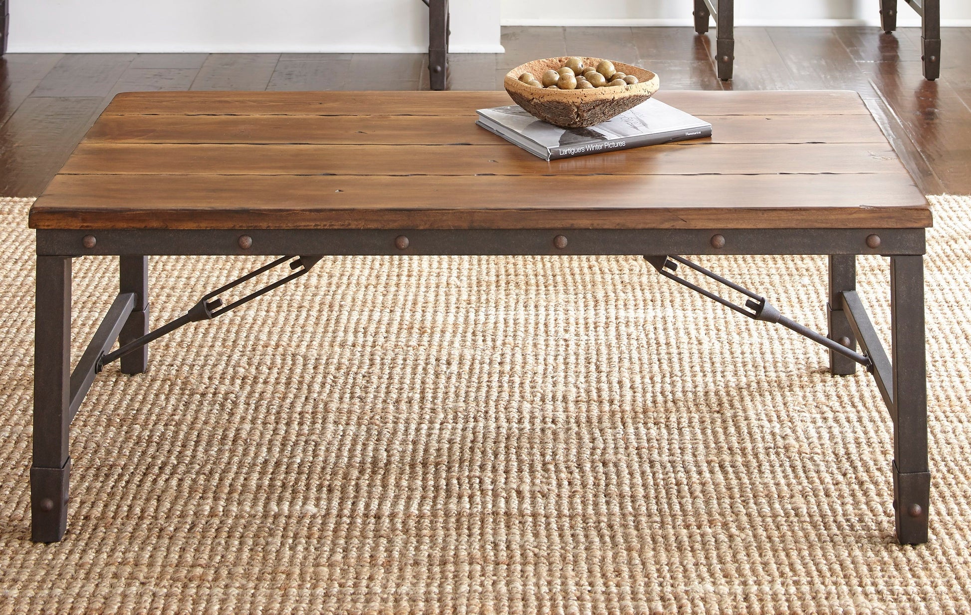 Take industrial design to a new level with the Ashford Cocktail Table. A simulated plank top, riveted iron sides, and industrial designed stretchers combine for a restoration look without being bulky. Sturdily constructed using engineered hardwoods and pine veneers in a warm, antiqued honey finish. Also available in this collection (purchased separately) are the matching end table, sofa table and chairside end table.