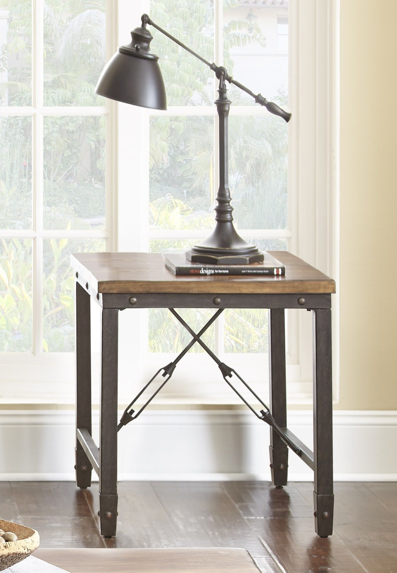 Take industrial design to a new level with the Ashford End Table. The simulated plank top, riveted iron sides and industrial designed stretchers are combined for that restoration look without being bulky. Sturdily constructed using engineered hardwoods and pine veneers in a warm, antiqued honey finish. Also available in this collection (purchased separately) are the matching cocktail table, sofa table and chairside end table.