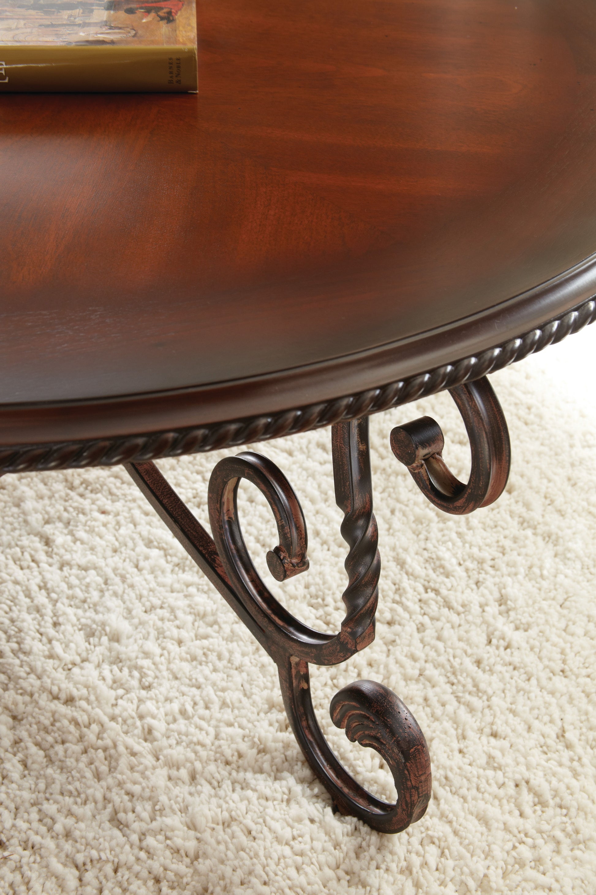Crowley brings the delight of traditional design to your living room with this collection of these delicate but substantial mixed-media tables. Elegant scrolling rope twist bases support a birch veneered top in a dark cherry finish with hand-applied burnish that will warm up any room and bring a smile to your face. Available in Cocktail, End or Sofa Table.