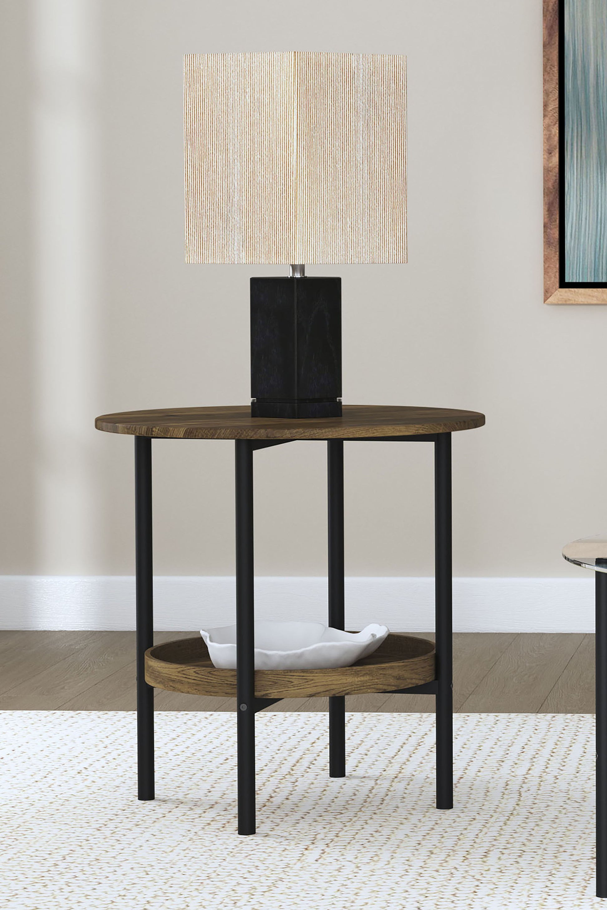 Complement an inviting living space with the stylish, understated design of a transitional round end table. It offers farmhouse charm with simple, clean lines and a neutral brown wood finish, perfect for a family space. The table boasts a round profile, creating a sense of flow within a sitting area. It includes a full lower shelf, complete with a tray profile, perfect for showing off decor that tells your personal story or suits your taste. A black finish metal frame is crisp and classic, complete with tubular metal legs.