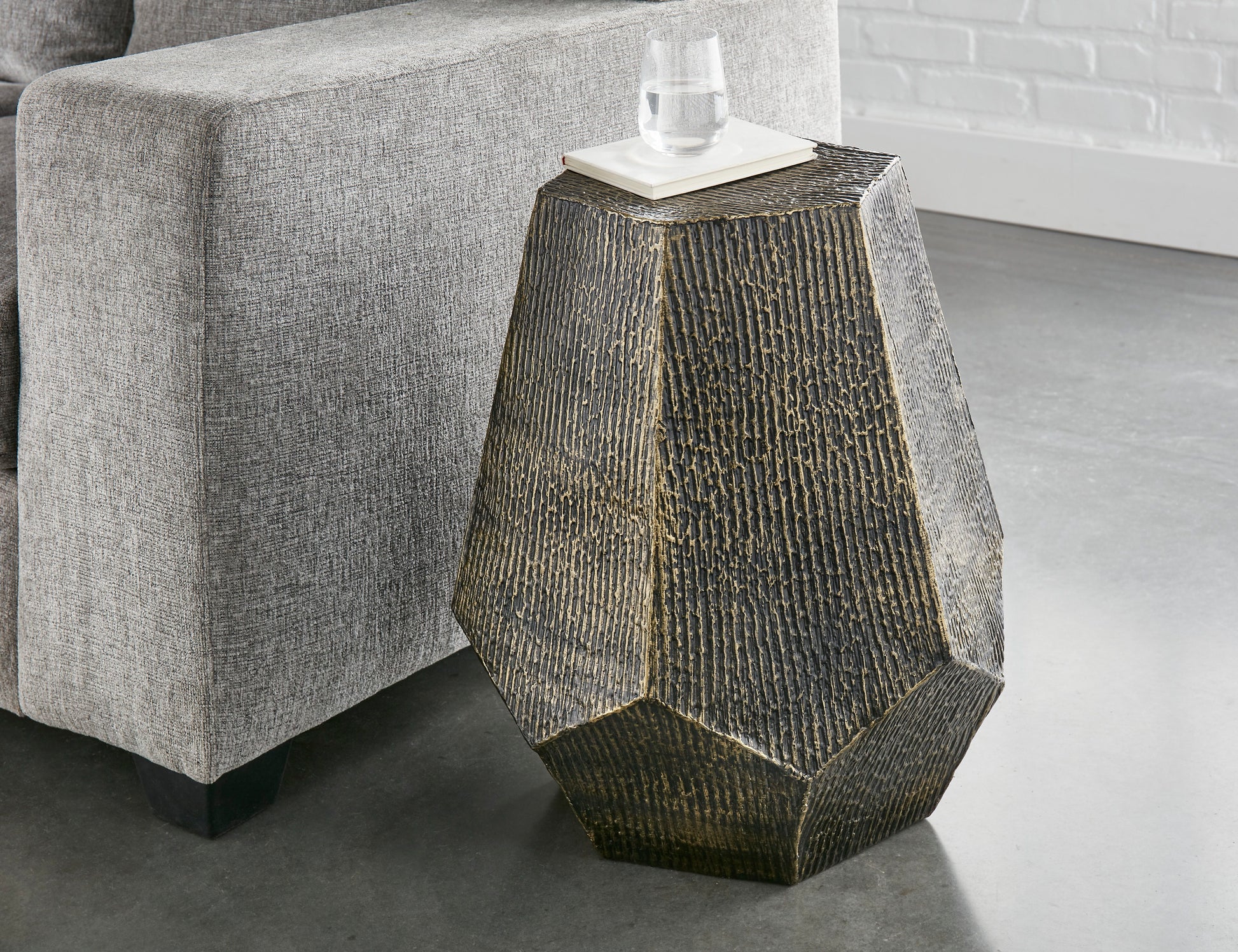 A hexagonal End Table with the appearance it was plucked from nature, the Donato End Table features a shimmering oil-rubbed brass finish over hand-stamped iron that creates a contemporary table built for modern style. Pair with the Donato Cocktail Table for a complete Living Room package.