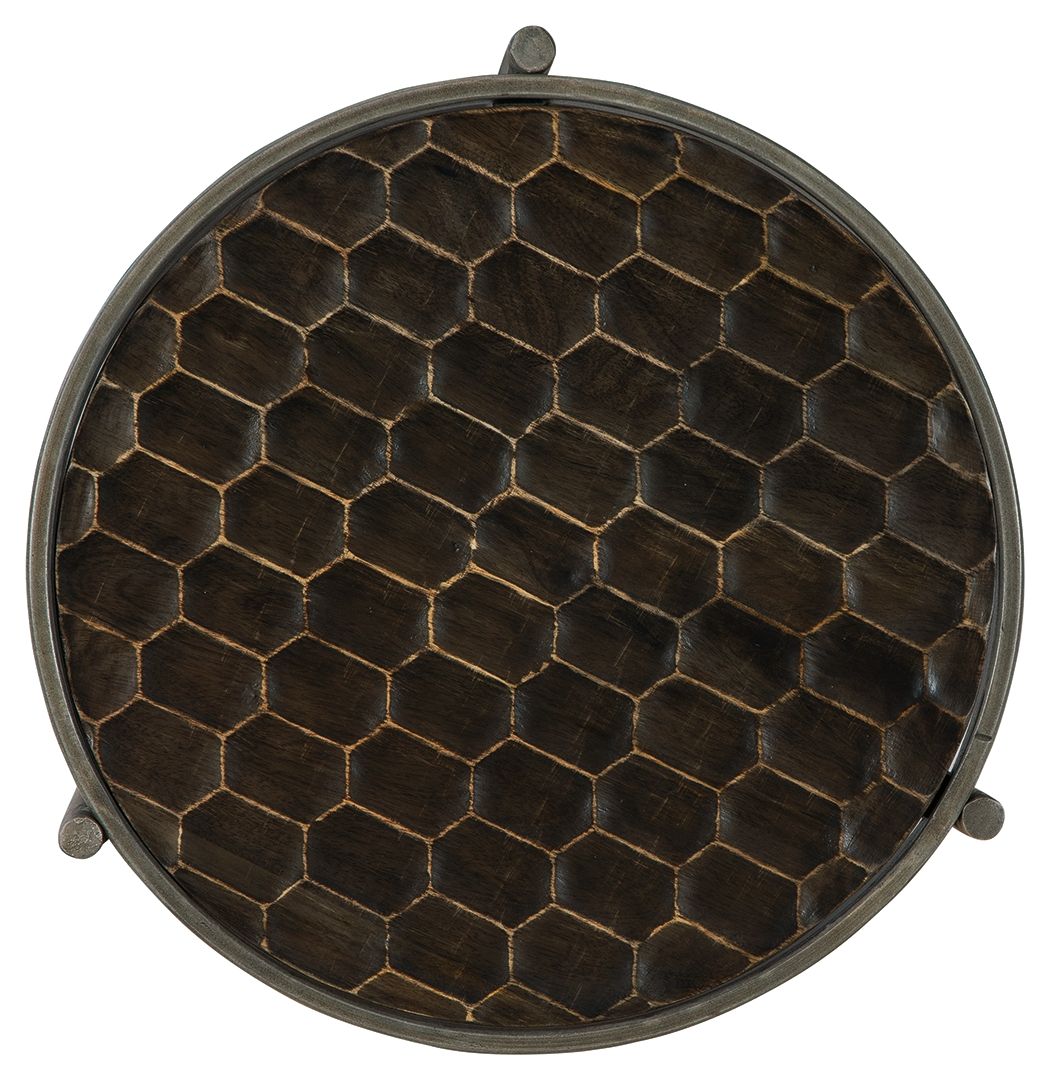 Play up your contemporary cool character with this chairside end table. The scooped honeycomb design on the top recalls retro motifs for a modern era, with a distressed brown finish enhancing the pattern. A round tubular base with a gray glaze rounds out the look. This table glows with a refined kind of radiance.