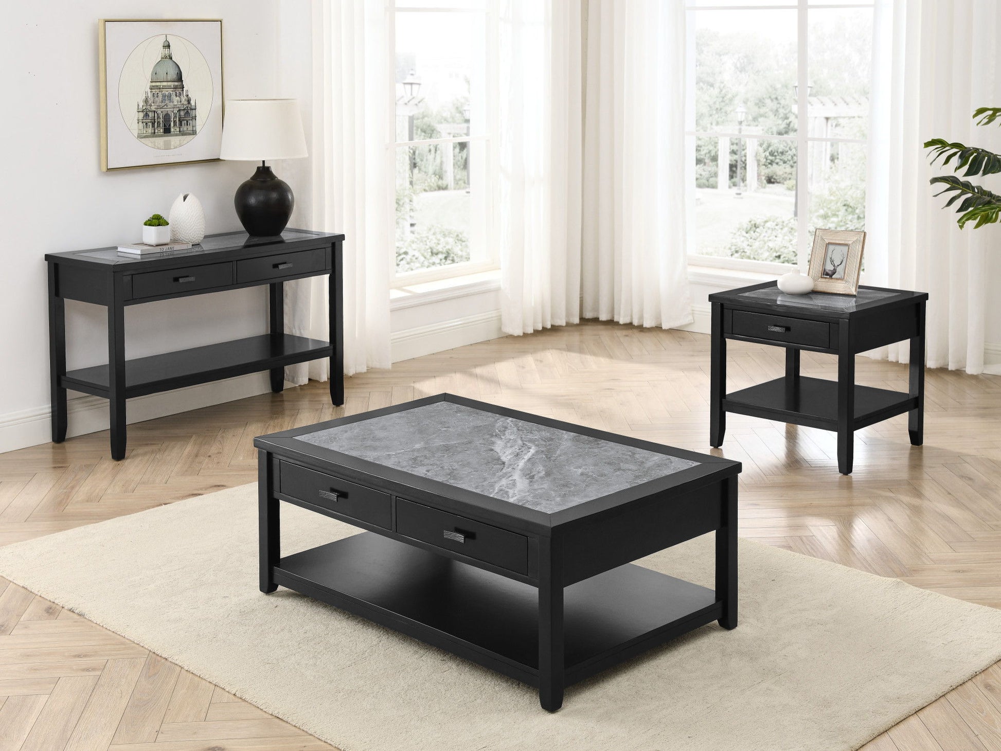 Transitional styling with a dark design, Garvine dresses up a living area with easy care style. Gray Sintered Stone tops add an elegant easy-care accent with enhanced performance features including moisture, scratch and heat resistance. Bottom shelves offer display or storage options while drawers in each piece offer valuable storage to a room. Cocktail and Two End Tables instantly update a living room - add the optional Sofa Table for a complete set.
