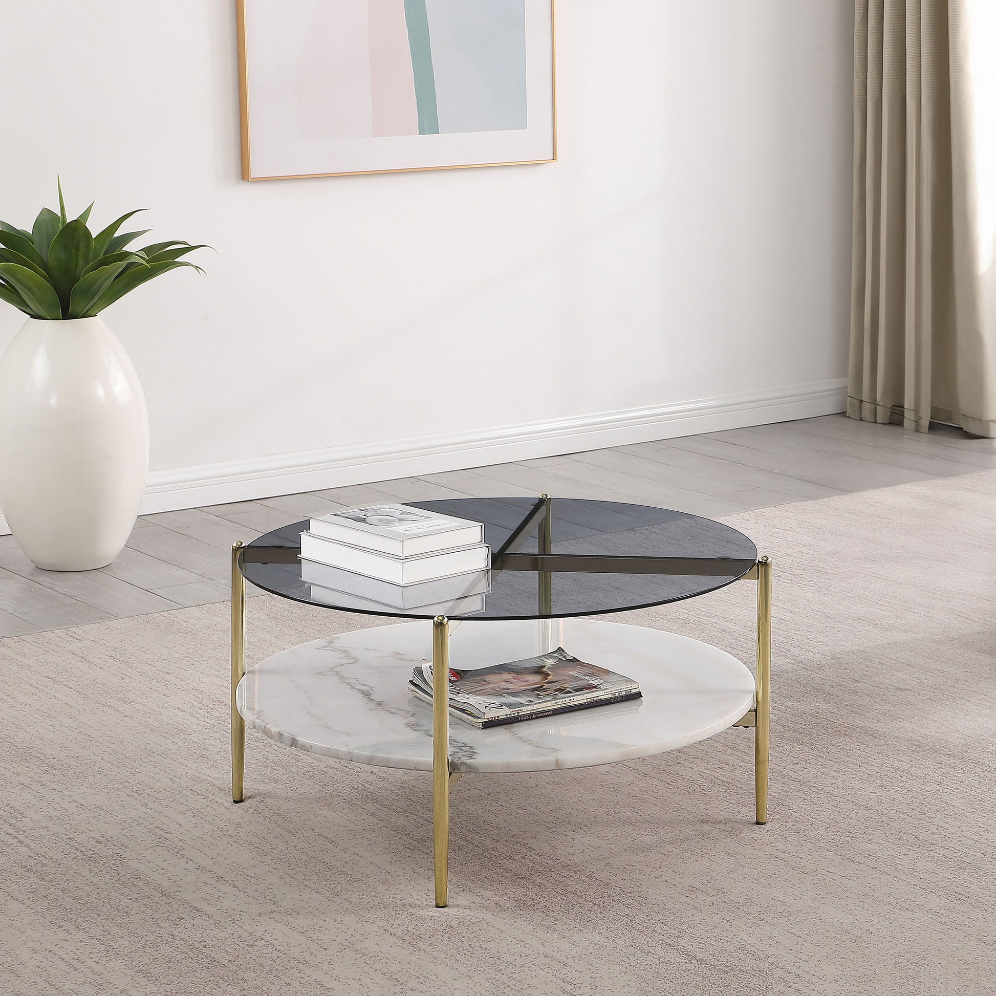 Jonelle - Round Glass Top Coffee Table White Marble Shelf Gold - Smoke
