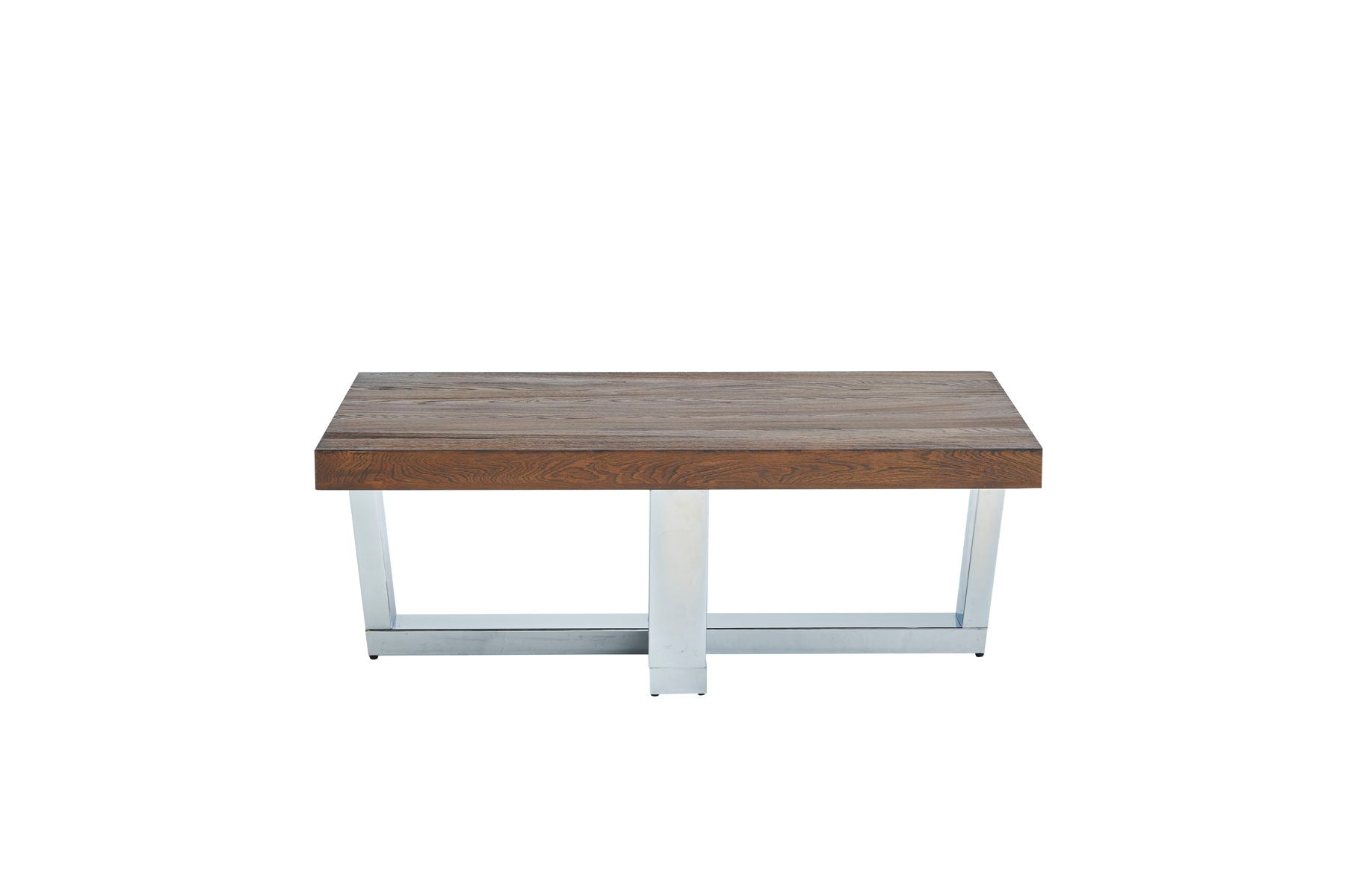 A rustic top and glam base combine in a relaxed elegant style to dress up everyday life. The substantial top and base of the Laredo creates a bold silhouette for the centerpiece of the living room. The 48 inch length allows ample room for storage with a multi-step finish that displays the grain and character of the Elm veneers beautifully while a sparkling chrome base adds a glimmering light and airy touch to the tables.