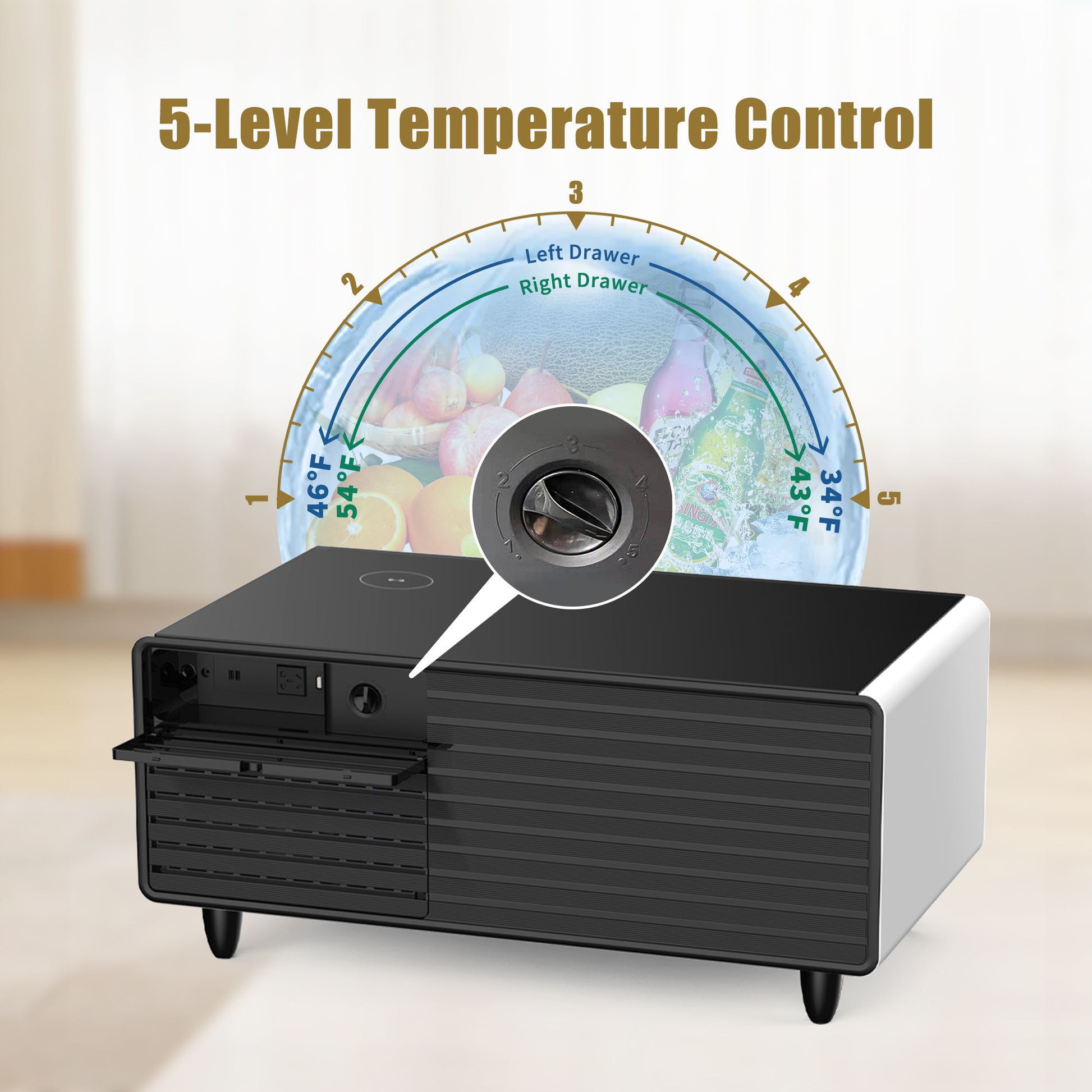 Refrigerated Storage Room: Dual refrigerator drawers with adjustable temperature knobs ensure beverages are kept at their optimal state, with the left drawer ranging from 34-46 F and the right drawer from 43-54 F. Partitioned Storage: Features dual partitions for easy organization and efficient food classification, including a sliding top box for flexible storage space. High-efficiency Compressor: Efficient compressor cooling system design ensures quiet operation, maintaining beverages at their ideal temperature at all times. Living Room Charging Station: Equipped with 10W wireless charging and USB ports to keep your devices powered up conveniently. Power Socket: Includes a power socket with a safety switch that cuts off electricity when usage exceeds the safety range to prevent danger.