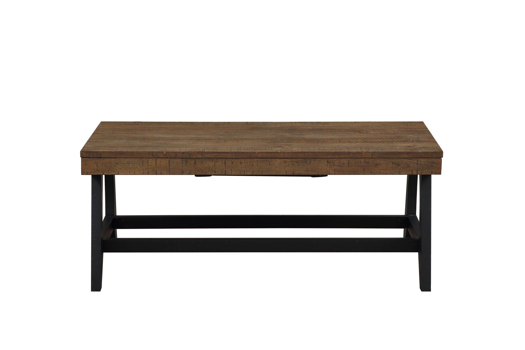A Lift-Top Cocktail Table with rustic transitional styling. Ralston features a warm two-tone caramel and ebony finish and physical distressing for an heirloom feel that works great in today's casual interiors. The Ralston Lift-Top pulls up for  convenient work or dining right from the comfort of your Sofa.