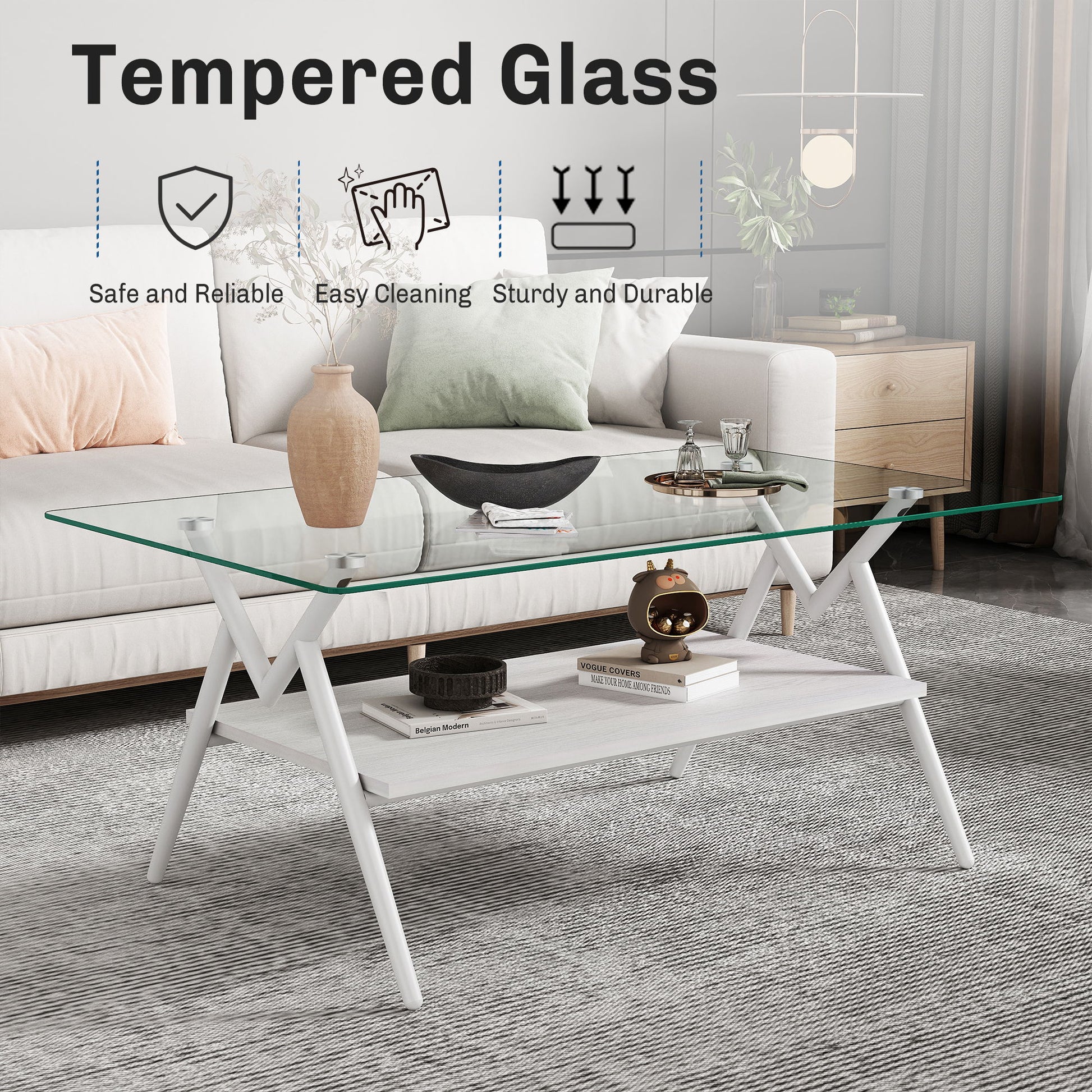Rectangle Coffee Table With Tempered Glass Top And Shelf, Modern Table For Living Room