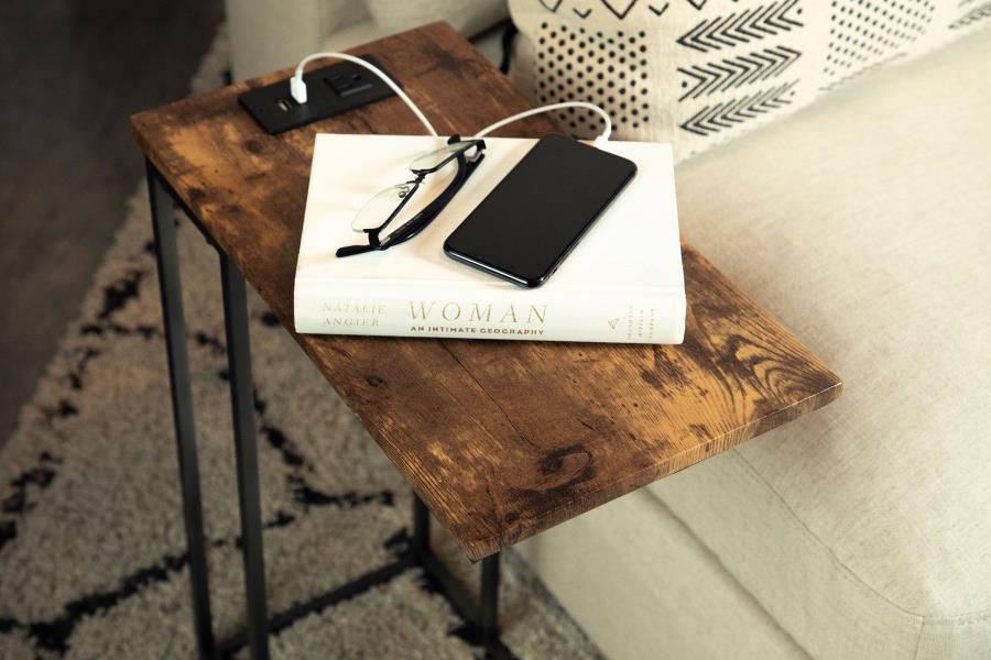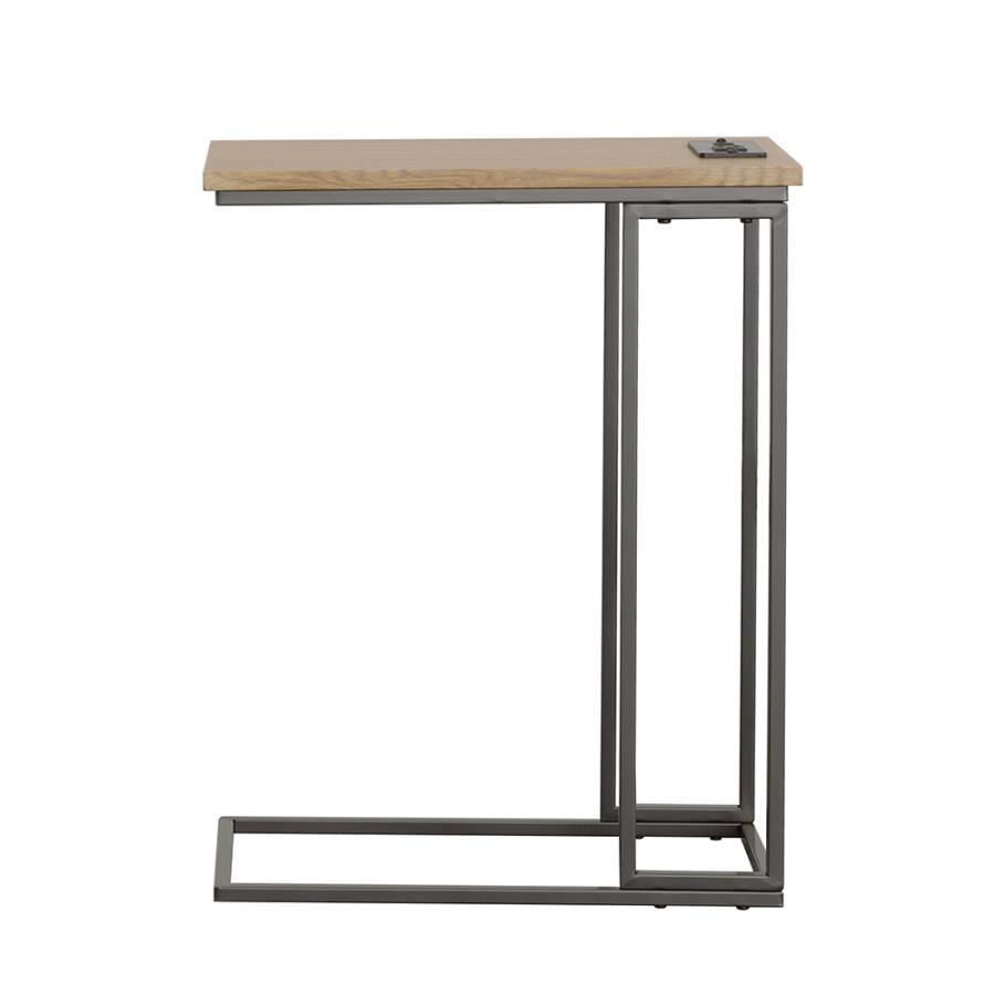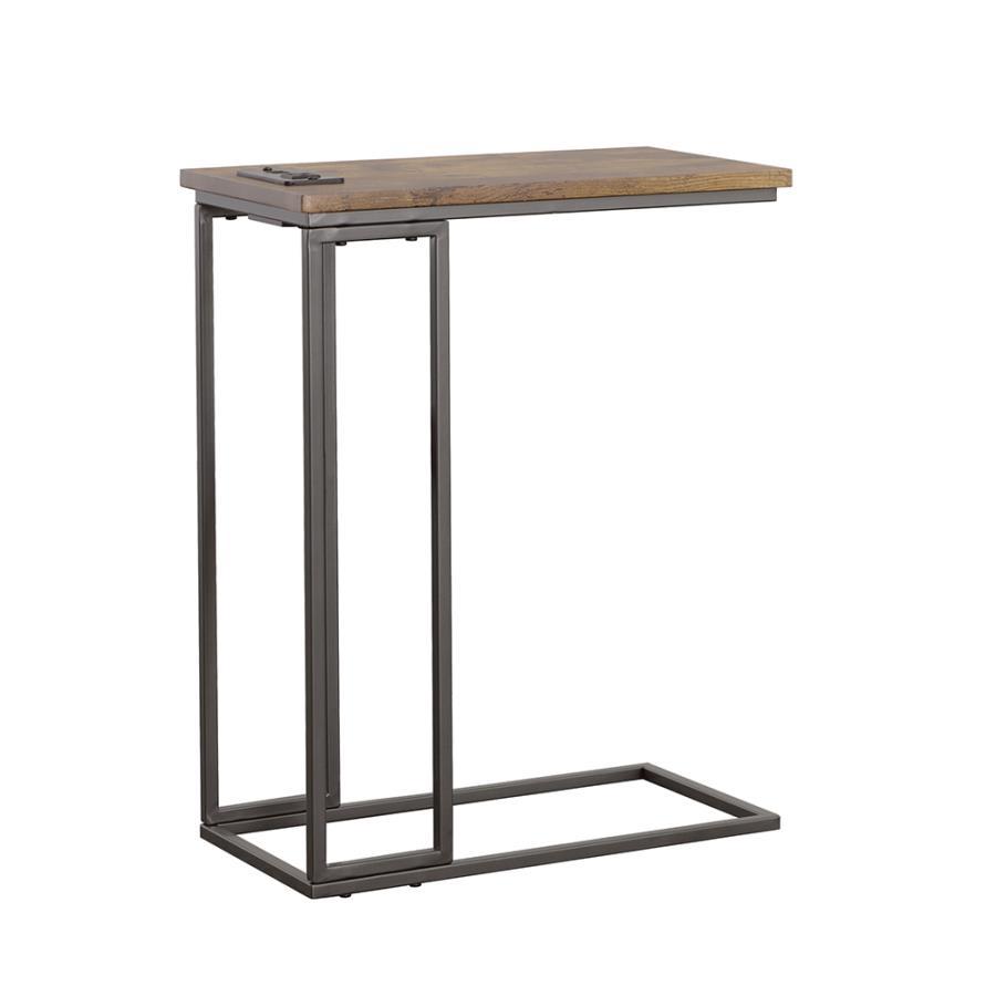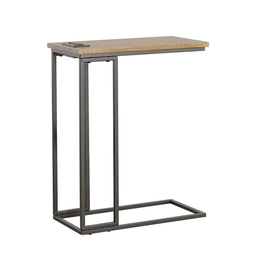Keep a refreshment nearby with this industrial style snack table. Complete with an elongated tabletop and base, this accent table slides easily over the arm of a chair or your lap. Its mixed material design features an engineered veneer in a natural woodgrain, contrasted by a sleek, rail-like metal base and supports in a dark gunmetal grey finish. In addition, this table offers two built-in USB ports and one power port for convenience. Place this snack table next to a corner accent chair to provide table space in a compact room.