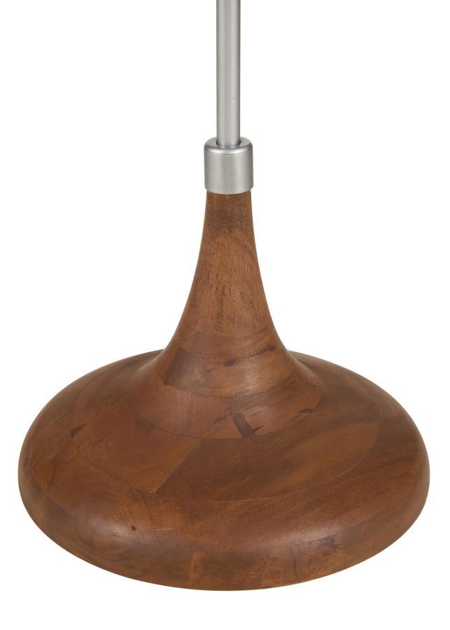 - A silver finish iron leg connects its top to a warm brown color mango wood base, creating a cymbal-like shape