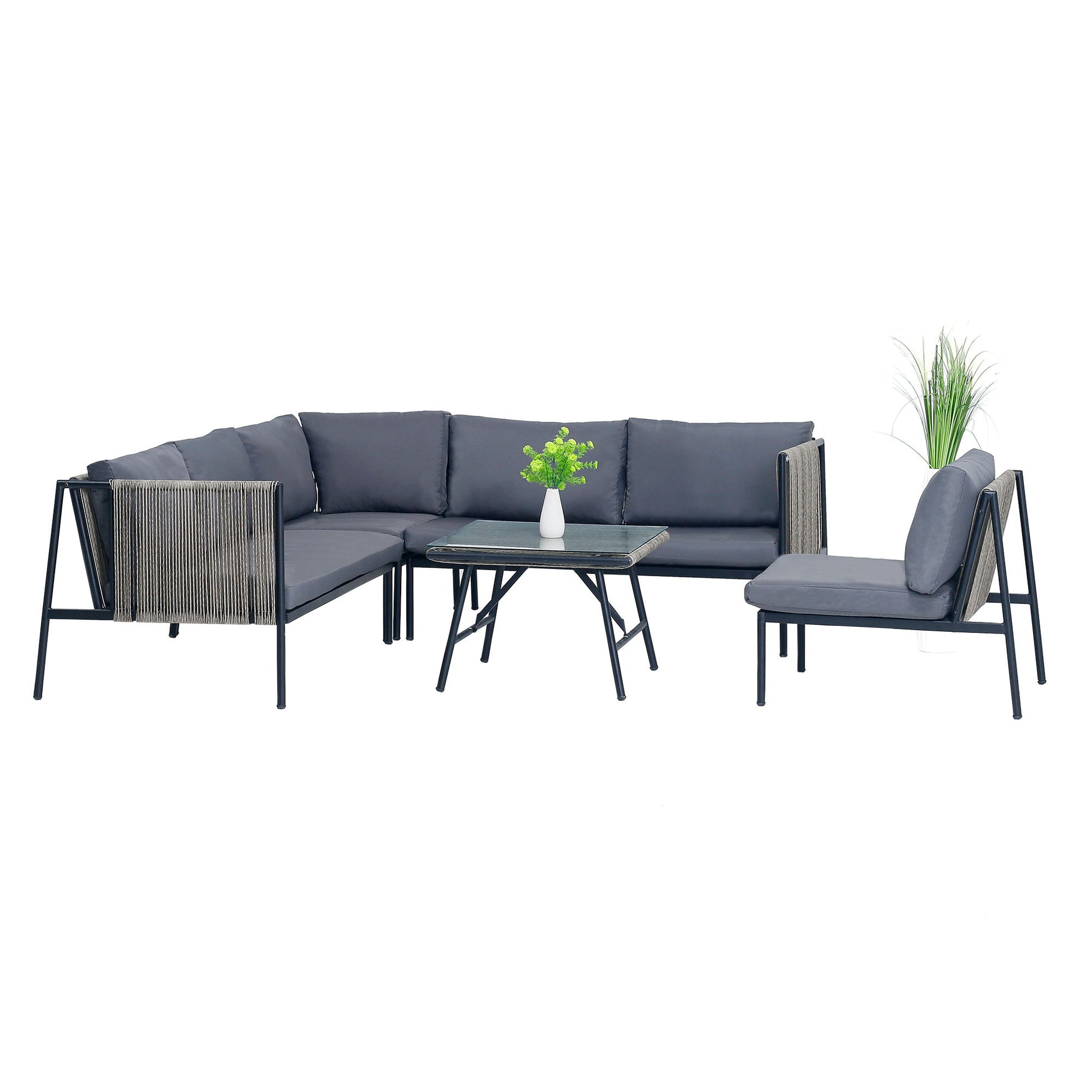 • Easy Assembly: Simple installation with hexagonal screws. Includes 2 double sofas, 1 corner sofa, 1 single sofa, and 1 coffee table.