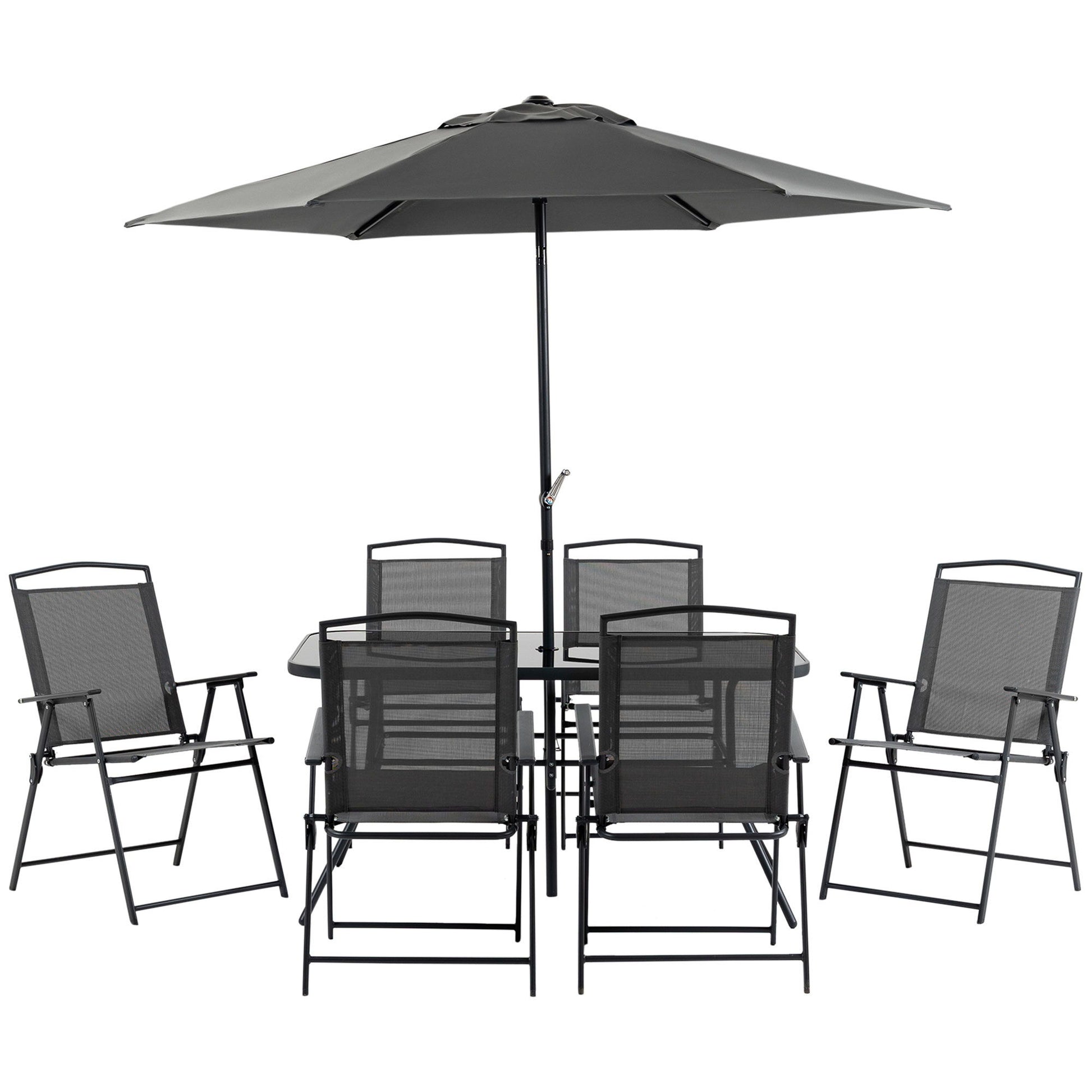 Outsunny - 8 Piece Patio Dining Set With Table Umbrella, 6 Folding Chairs And Rectangle Dining Table, Outdoor Patio Furniture Set - Black