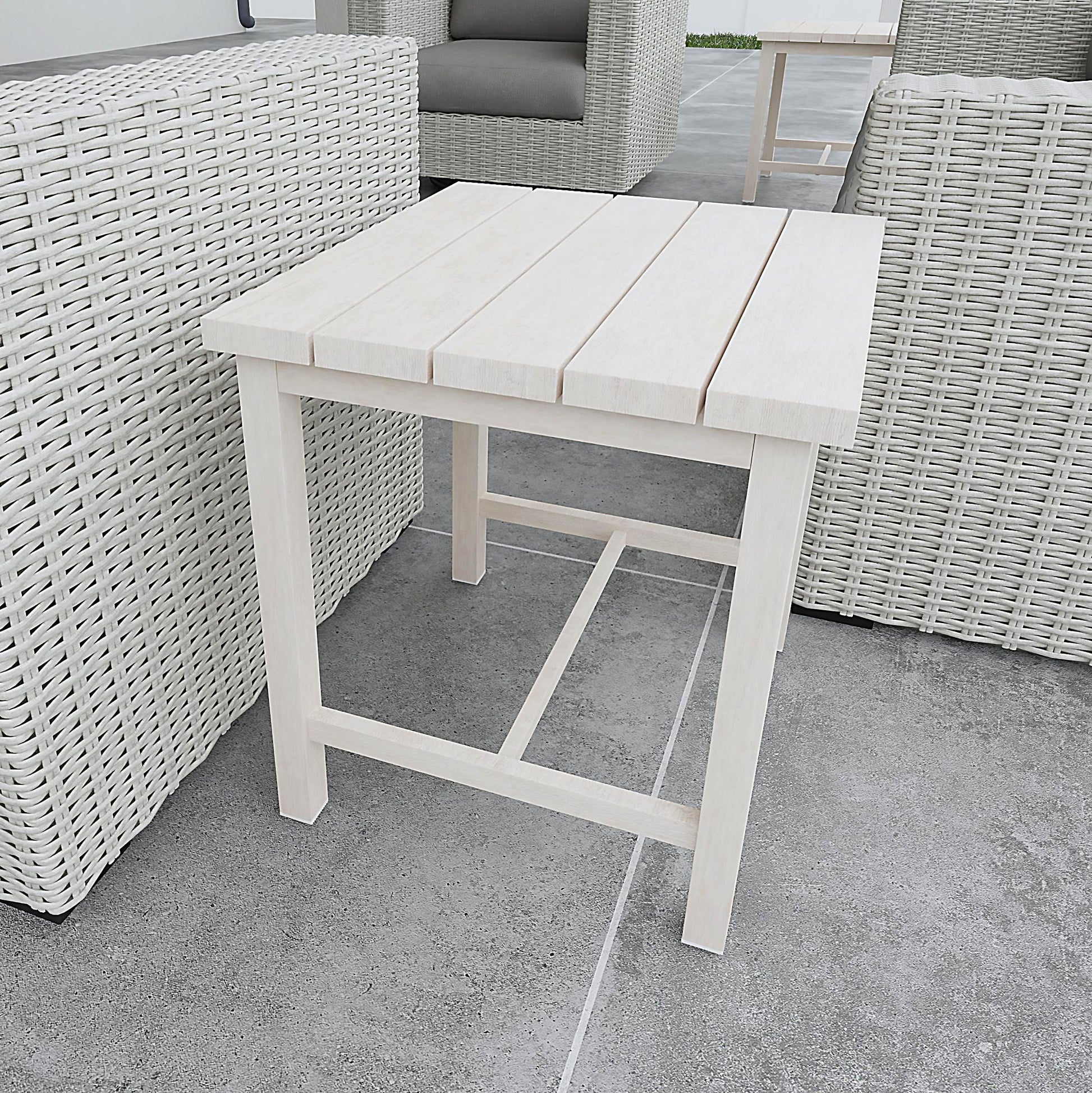Complete your outdoor seating area with the Blakley Outdoor End Table – the perfect addition to your patio or deck. With its solid aluminum construction, this weather-resistant side table is built to last and offers superior heat resistance compared to steel counterparts. Featuring a whitewashed birch look with a beautifully crafted plank top, the Blakley Outdoor End Table brings a light and fresh approach to outdoor design, adding a touch of natural charm to your outdoor space. Its dual stretchers provide added stability and durability, ensuring it will last for years to come. Adjustable levelers on the bottom of the table legs allow for easy stability on uneven floors, making it easy to enjoy drinks, snacks, or your favorite book without worrying about spills or wobbly furniture. Upgrade your outdoor living space with the Blakley Outdoor End Table and add functionality and style to your patio or deck. Whether you're lounging on the Blakley Outdoor Sofa or enjoying a peaceful moment on the Blakley Outdoor Lounge Chair, this end table is the perfect complement to your outdoor seating area.