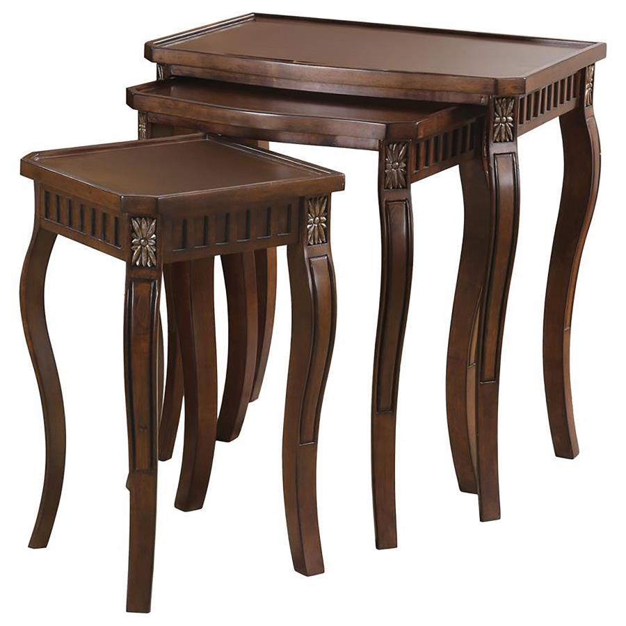 Elegance and romance combine to offer a tasteful decor addition. Add a graceful look to traditional spaces with this three-piece nesting table set. Ornate design upgrades include gentle contours on each leg and on beveled surfaces. Finished in warm brown, this set delivers a stylish and radiant look. Gold painted designs and carvings step up the artful personality of each table.