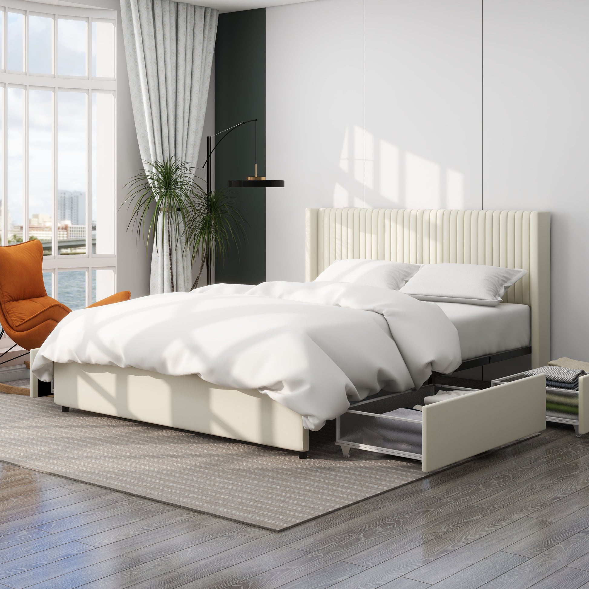 Anna - Queen Upholstered Wingback Platform Bed With Patented 4 Drawers Storage - Ivory