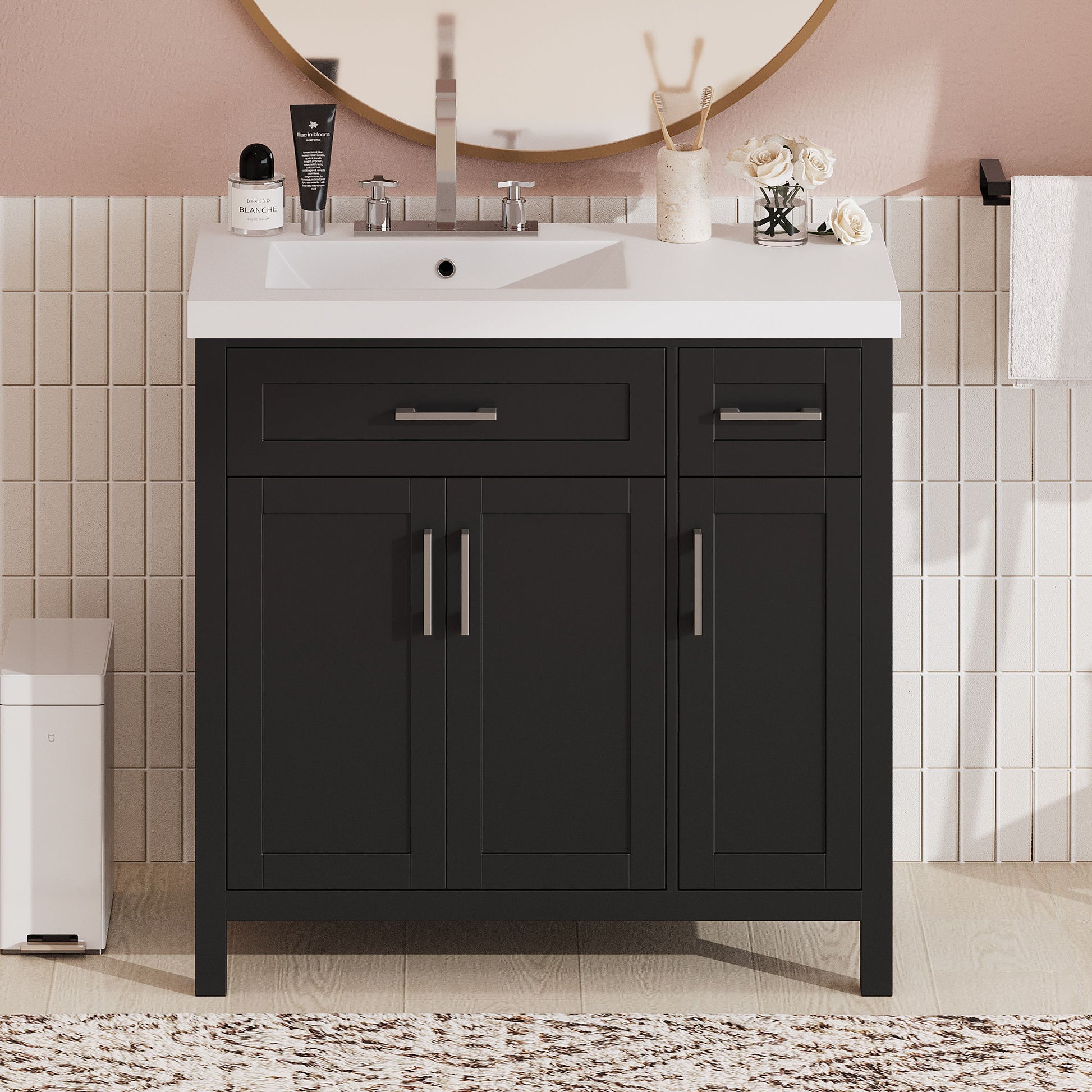 Spacious Design: The vanity measures 36*18*36 inches, offering ample space for bathroom essentials. Premium Materials: Constructed with a durable resin basin, solid wood frame, and MDF for easy maintenance and longevity. Overflow Protection: Includes an overflow hole to prevent spills and maintain a dry bathroom environment. Versatile Storage: Features 1 deep drawer, 1 flip drawer, and 2 adjustable shelves for varied storage options. Easy Assembly: Comes with detailed instructions for easy assembly; recommended to be assembled by two people.