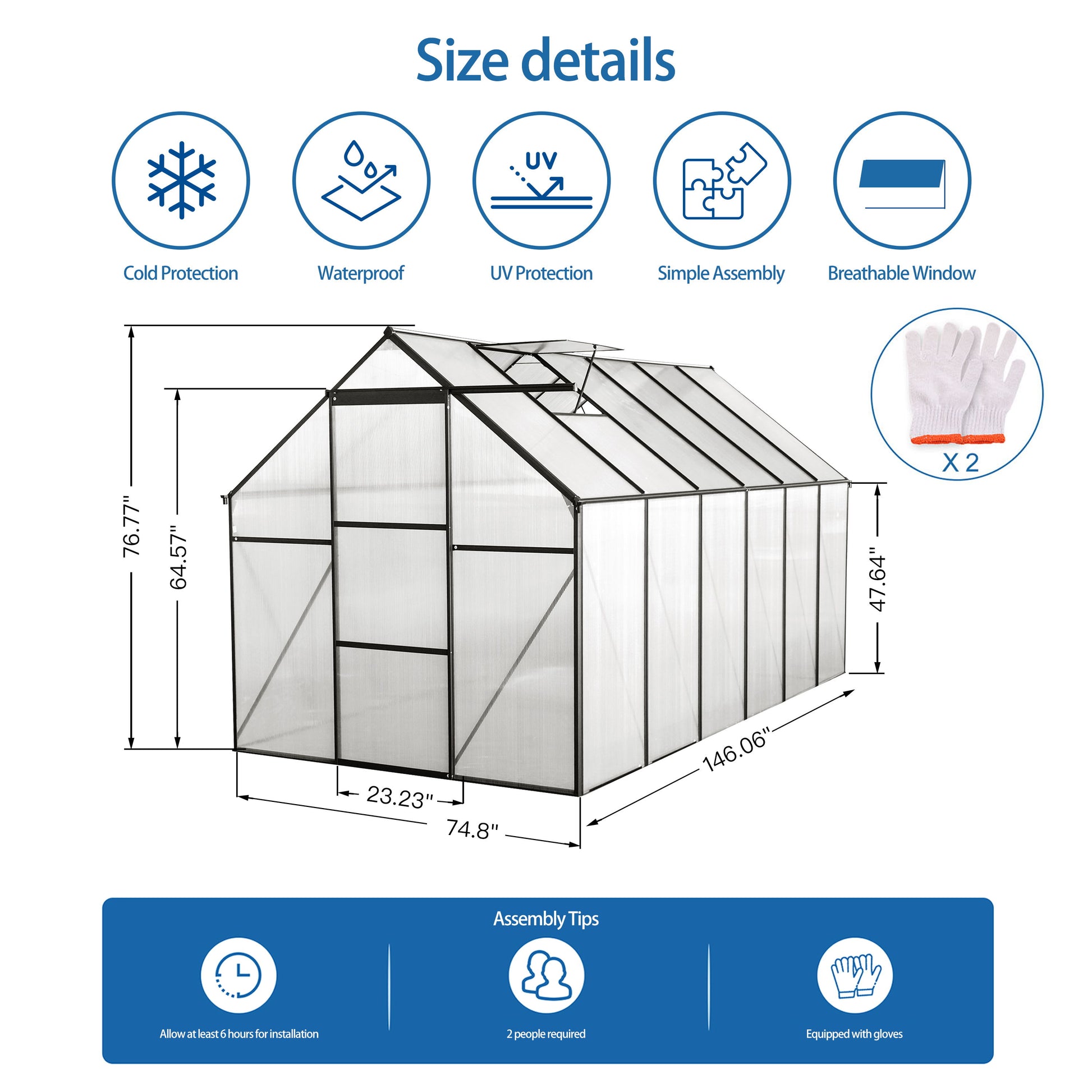 Efficient Drainage System & Galvanized Base: The greenhouse features a drainage gutter system to prevent water accumulation, a sloped roof design, and a galvanized base for stability and protection. Convenient Sliding Door: The sliding door allows easy access while keeping animals out, and detailed assembly instructions are included for straightforward setup. Adjustable Roof for Ventilation: The adjustable roof enables insect pollination, seed sowing, and continuous fresh air circulation, promoting plant growth with a built-in ventilation system. Heavy-duty & Durable Construction: Constructed with 4mm polycarbonate boards for temperature resistance, an aluminum alloy frame with powder coating for durability, and panels that allow optimal light transmission while blocking harmful UV rays. Spacious Walk-in Greenhouse: The greenhouse provides ample space for planting, flexible arrangement of plants, protection from extreme weather conditions, and creates an ideal environment for successful plant growth.