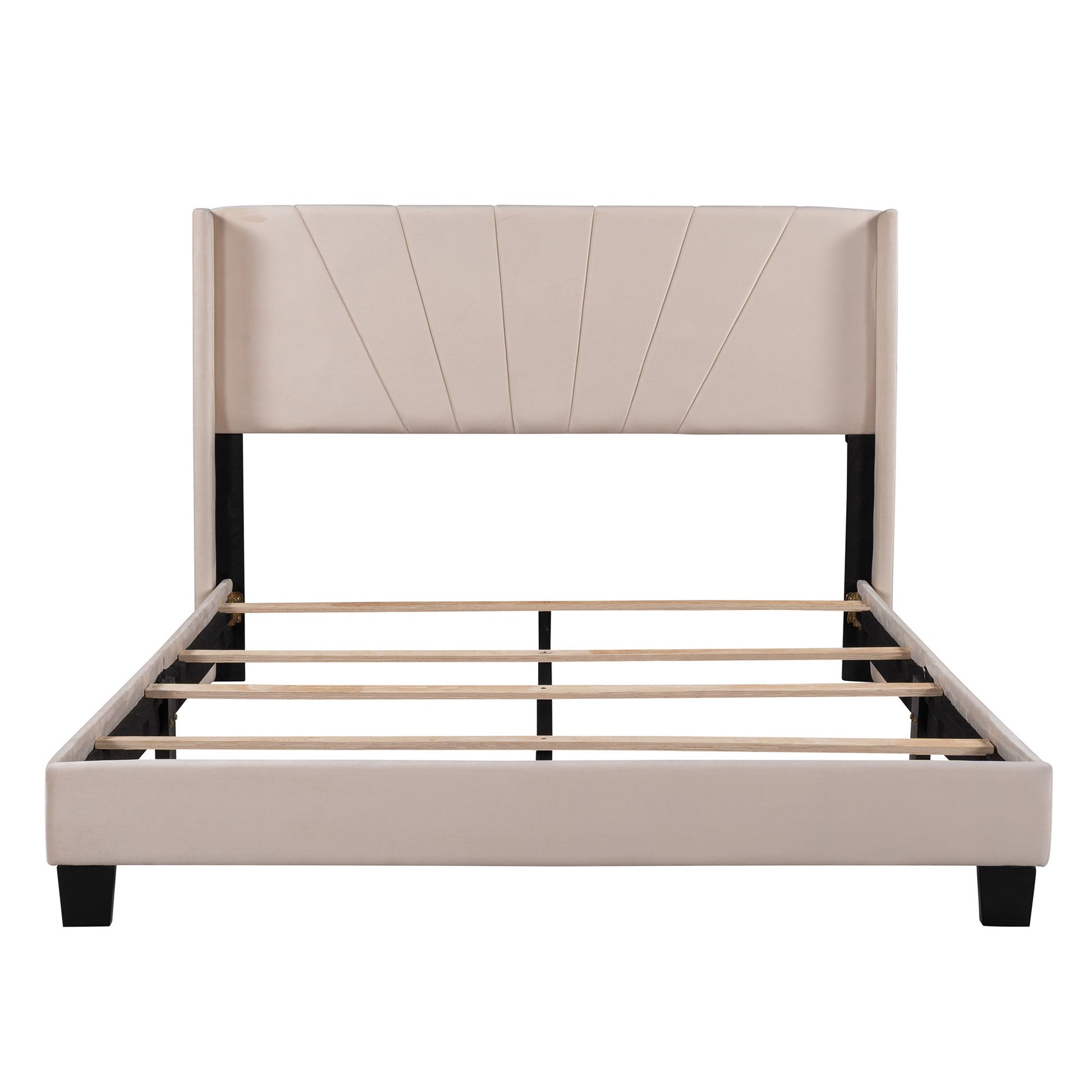 Queen Size Velvet Upholstered Platform Bed, Box Spring Needed - Beige