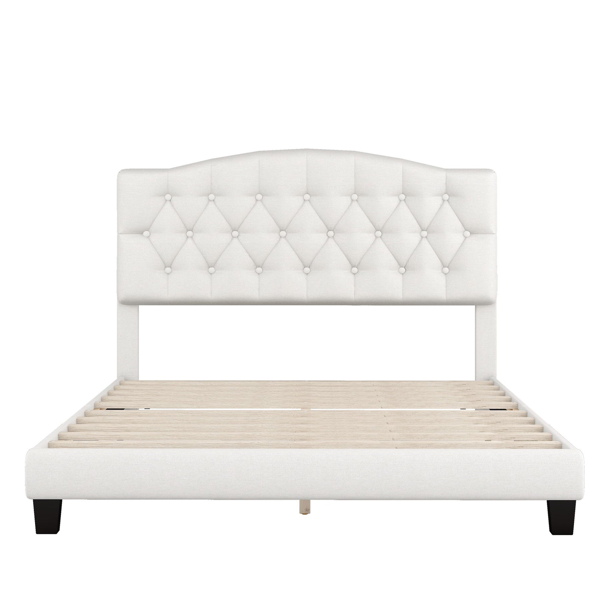 Queen Upholstered Platform Bed With Saddle Curved Headboard And Diamond Tufted Details - Beige