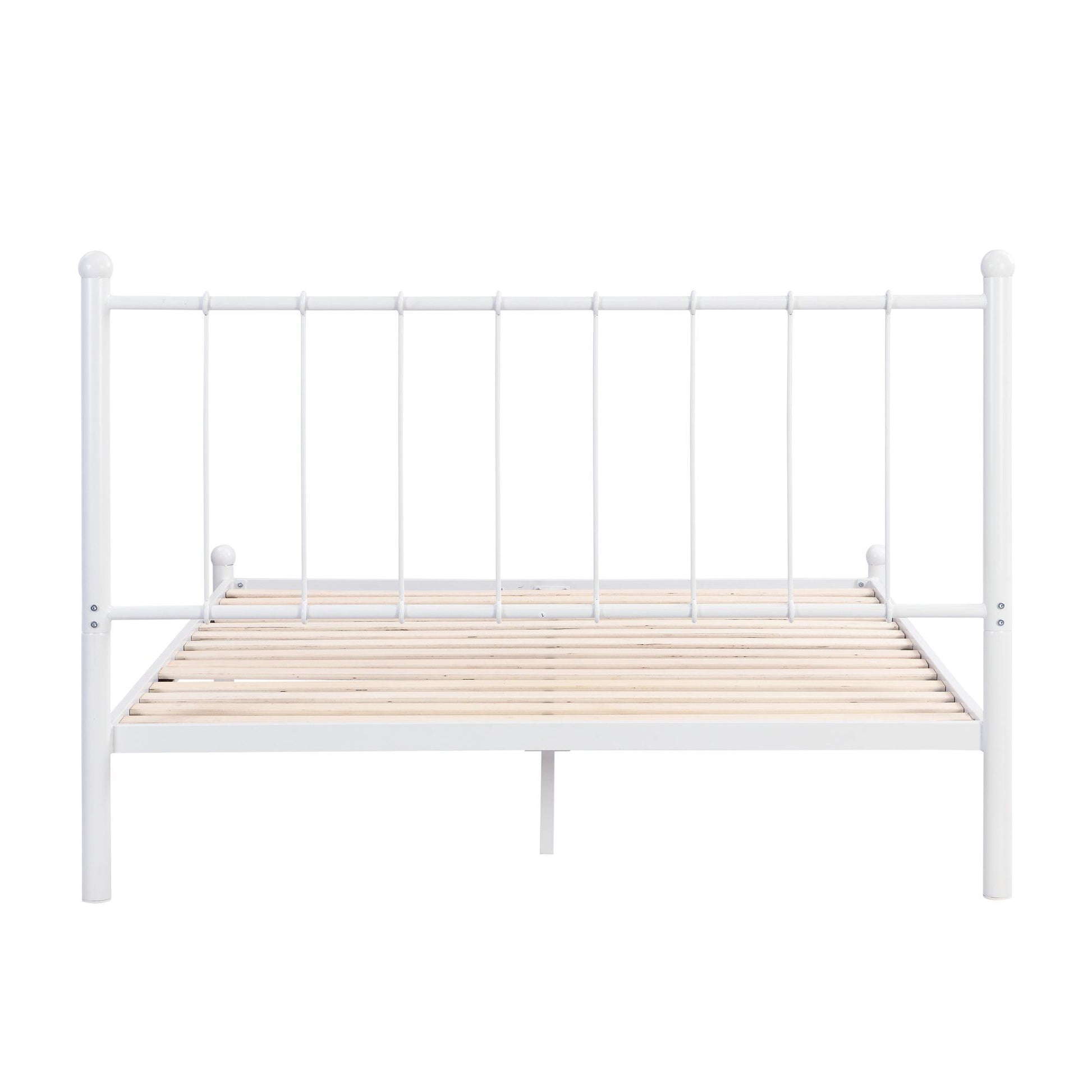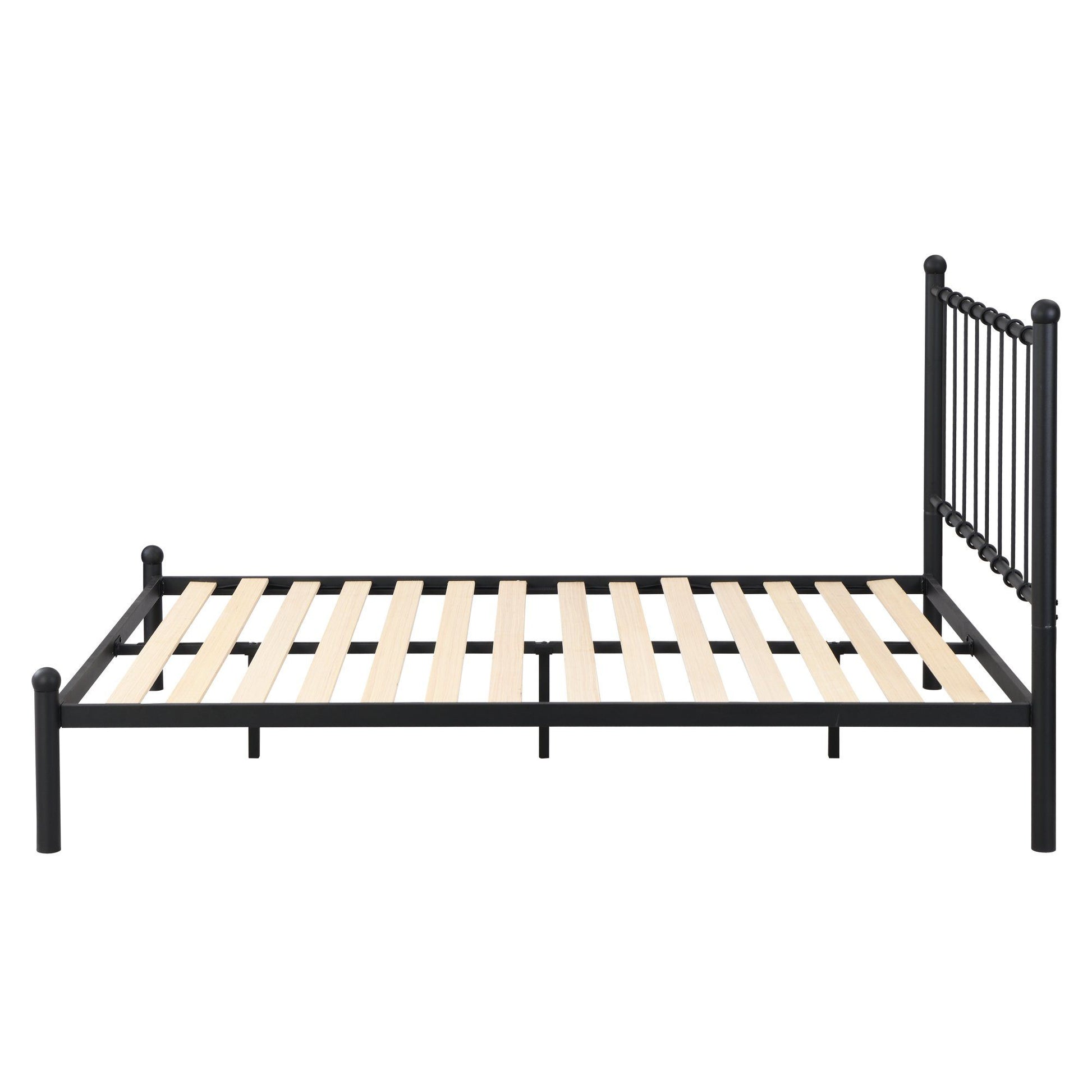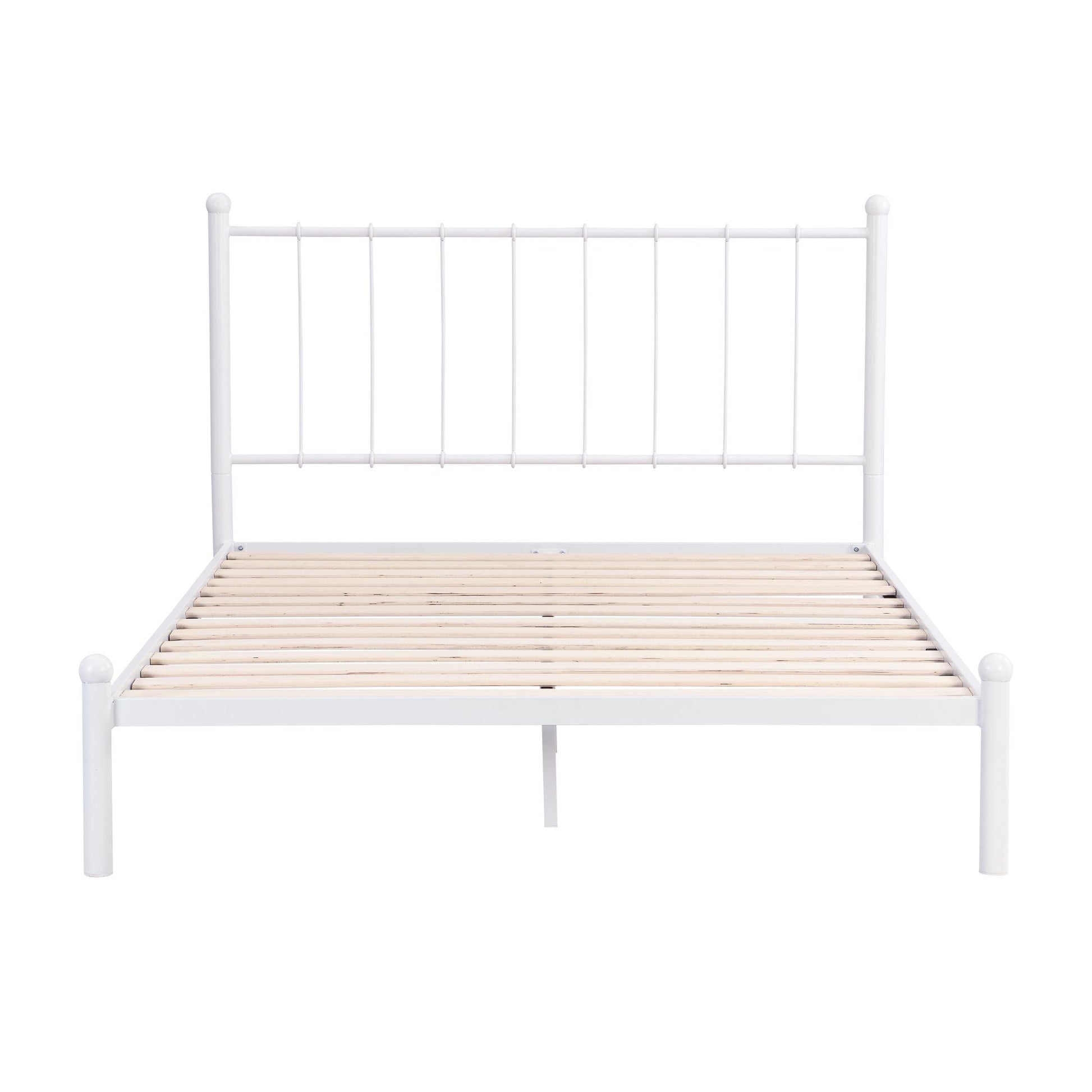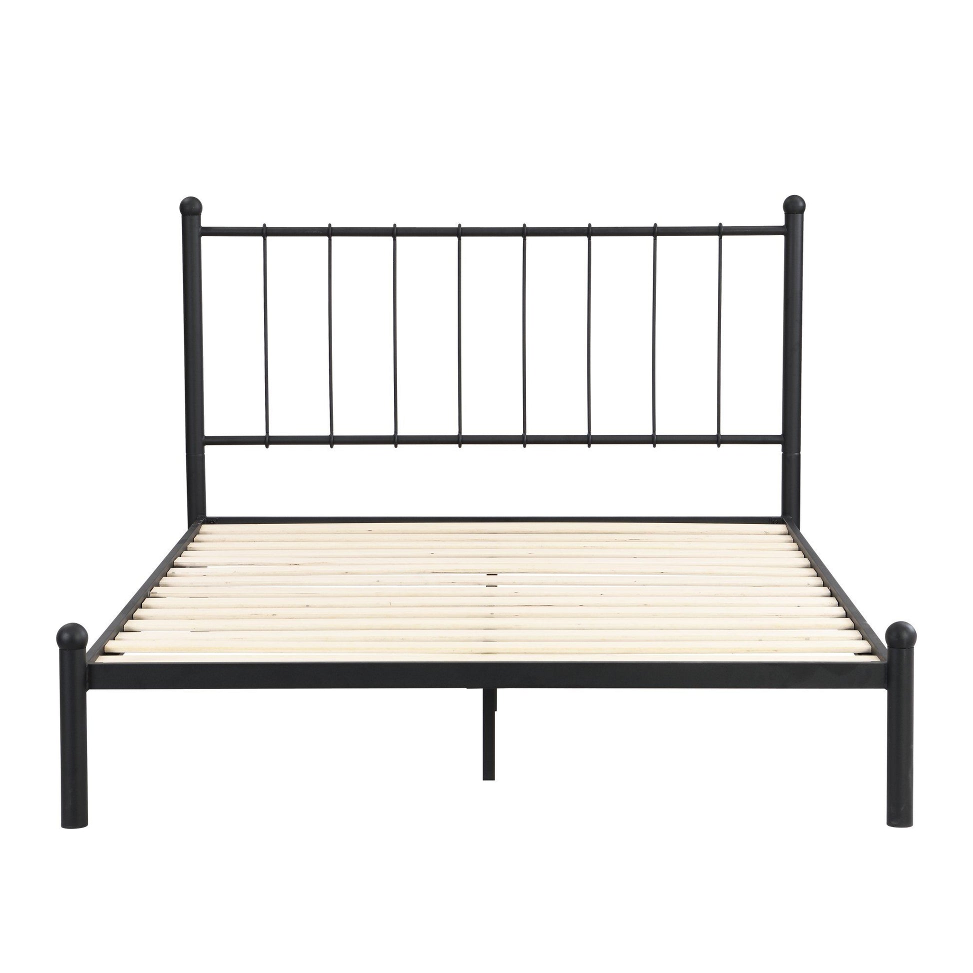 A platform bed with a sleek metal frame and simple round accents. The modern-style frame offers 10 inches of underbed clearance and does not require a box spring. This bed comes with a wooden slat roll and center support that provides a solid foundation, plus it’s compatible with an adjustable bed base. All hardware is included for easy assembly.