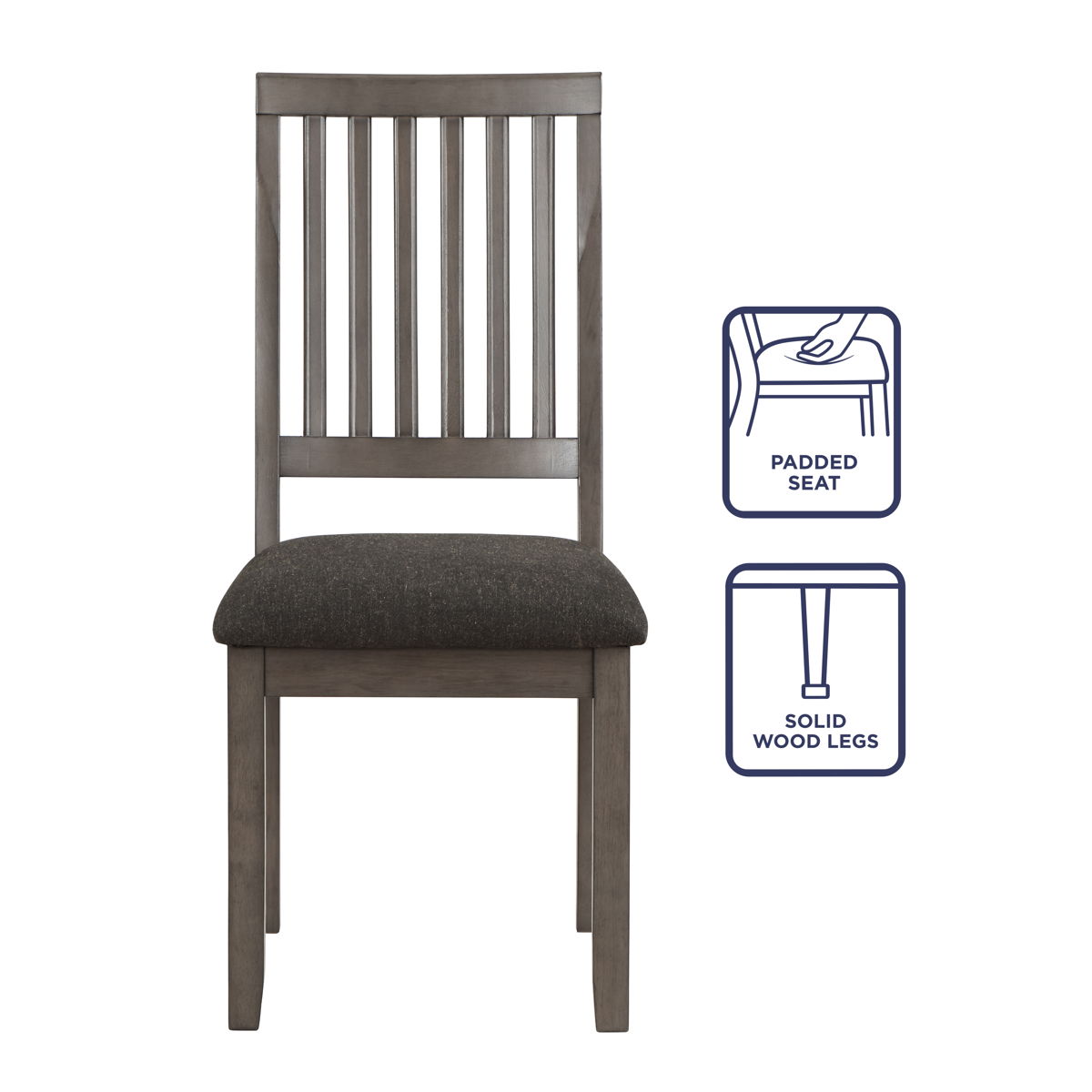 Yorktown adds style to small area dining with this dinette set. Transitionally styled with mid-century modern influences, Yorktown features a lustrous espresso finish over mindi veneers in a 42-inch round table that is both cozy and functional. Solid wood chairs are upholstered in a modern gray tweed for a comfortable seat and feature vertical slat backs and tapered legs that complement the canted tapered legs of the table.
